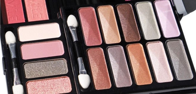 - Пълен набор в едно: сенки, ружове, глансове, пудри, молив, инструменти.