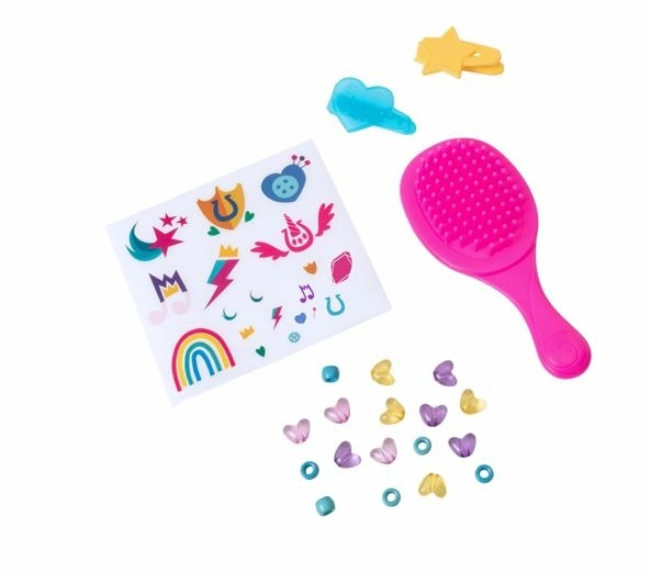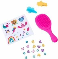 Комплектът включва богат набор от аксесоари като гребен, шноли и мъниста за безкрайни възможности за прически и декорация.
