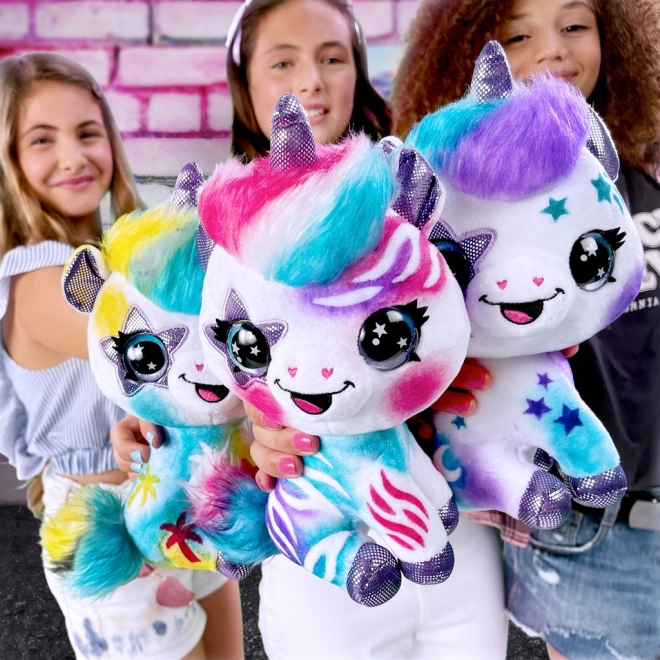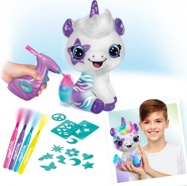 Лесно пръскане на цветове върху плюшения еднорог с помощта на шаблони или на ръка. Перфектно за начинаещи и малки артисти.