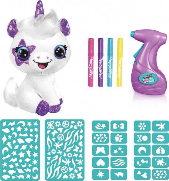 Превърни белия плюшен еднорог в оригинално произведение. С лесния за ползване airbrush инструмент и самозалепващите шаблони ще създадеш звезди, сърчица и цветни преливки. Когато пожелаеш промяна, просто измий или изперѝ в студена вода и твори отново.