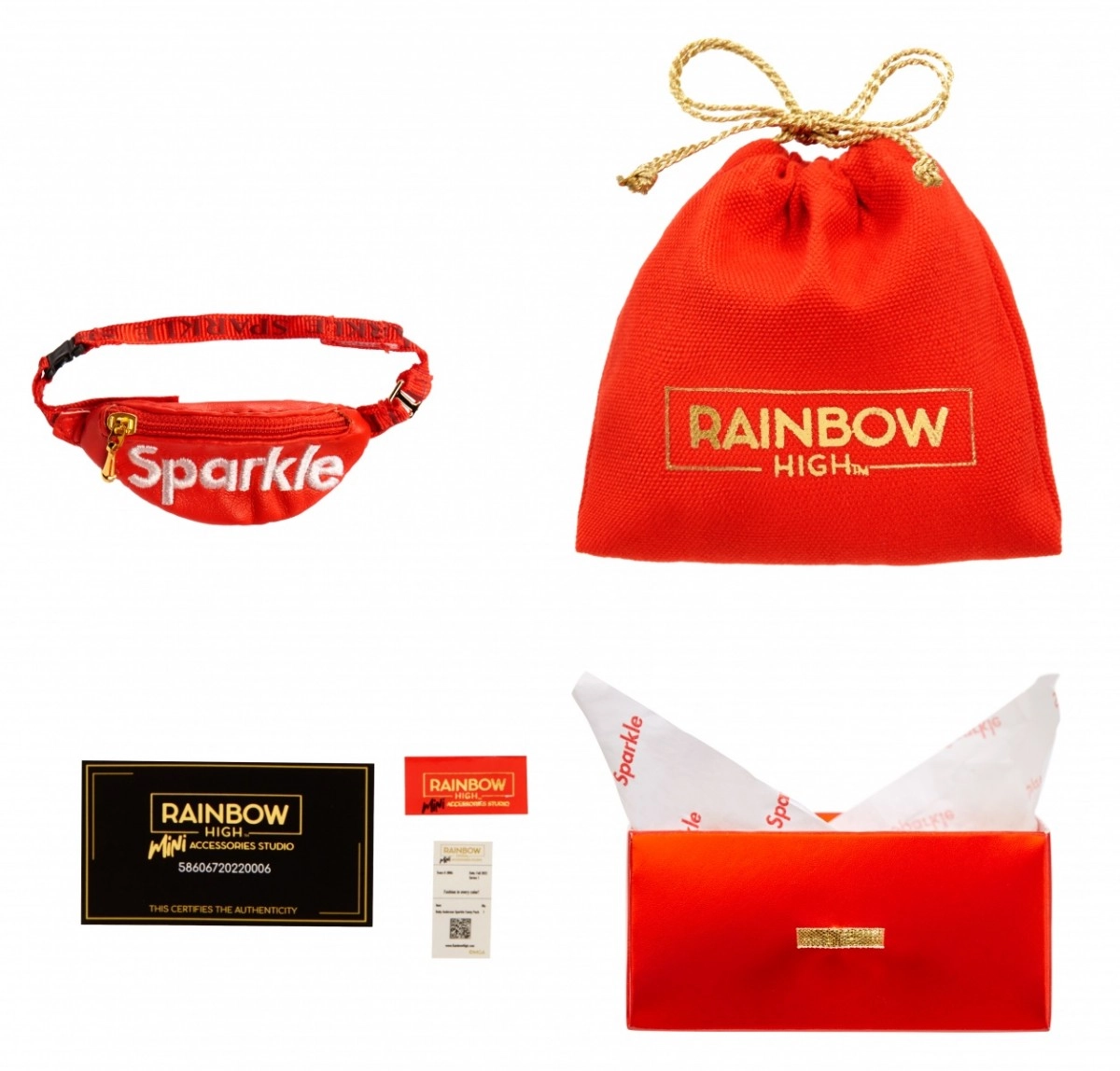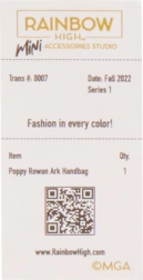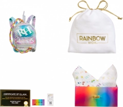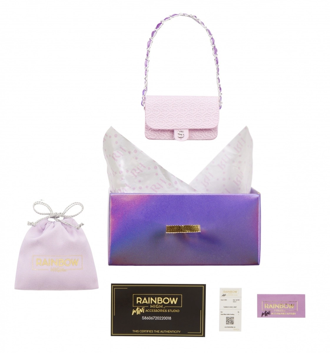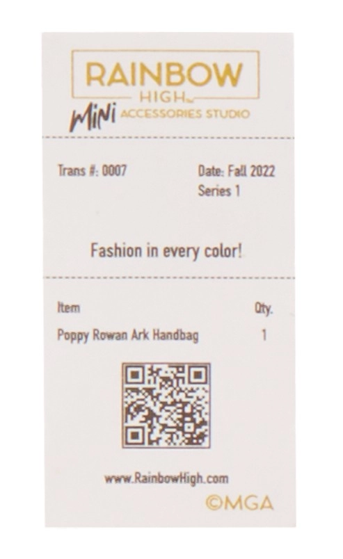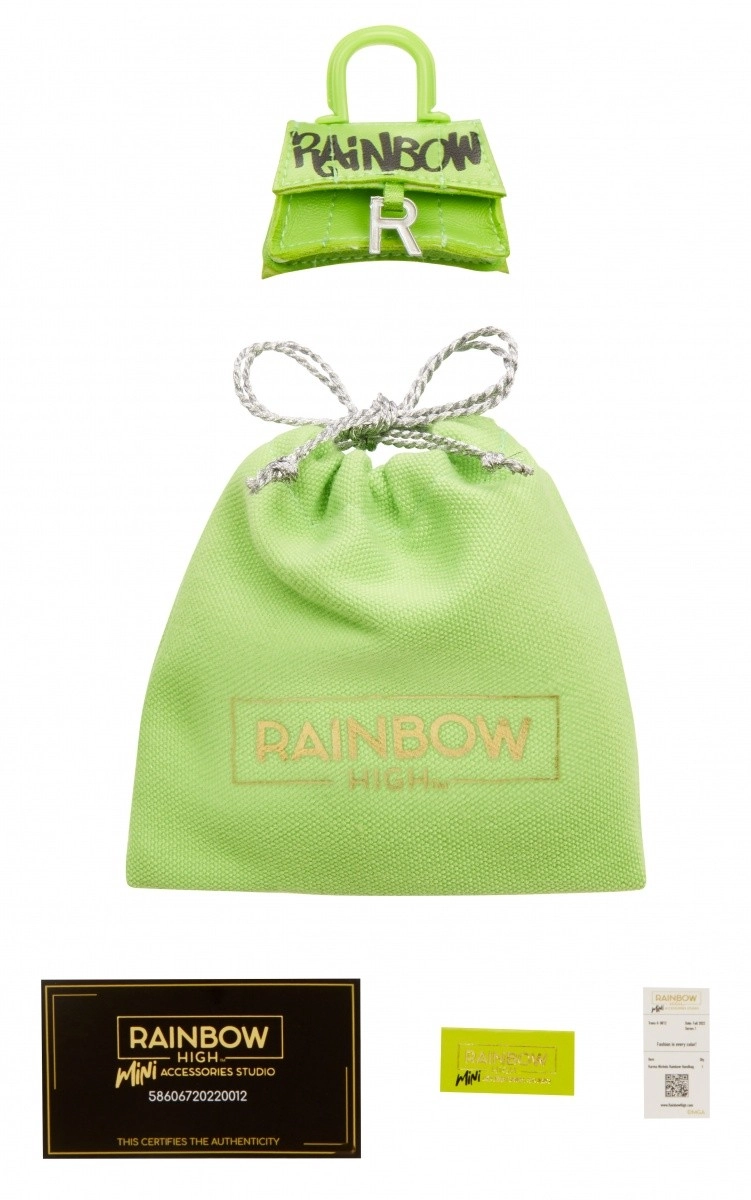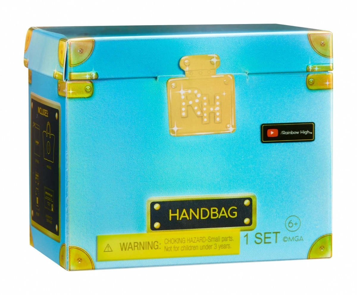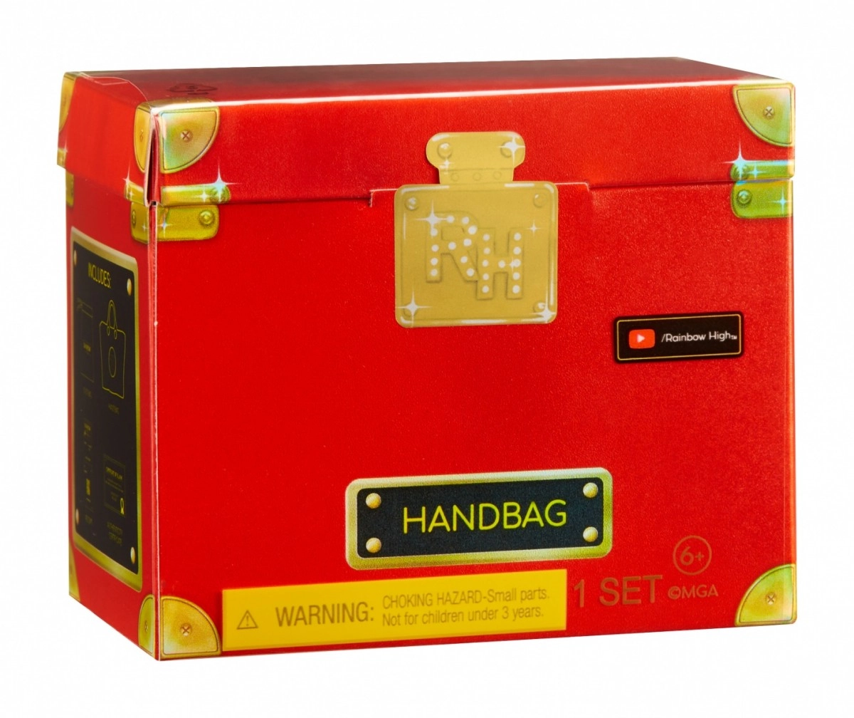 В колекцията ще откриете 27 различни чанти – от ежедневни до вечерни стилове. Изберете между тоут чанти, раници, чанти за кръста или вечерни клъчове. Всяка чанта е опакована в иконичния куфар на Rainbow High, който съдържа предпазен плик, хартиена салфетка, стикер и дори отпечатана касова бележка с подходящо калъфче.