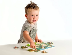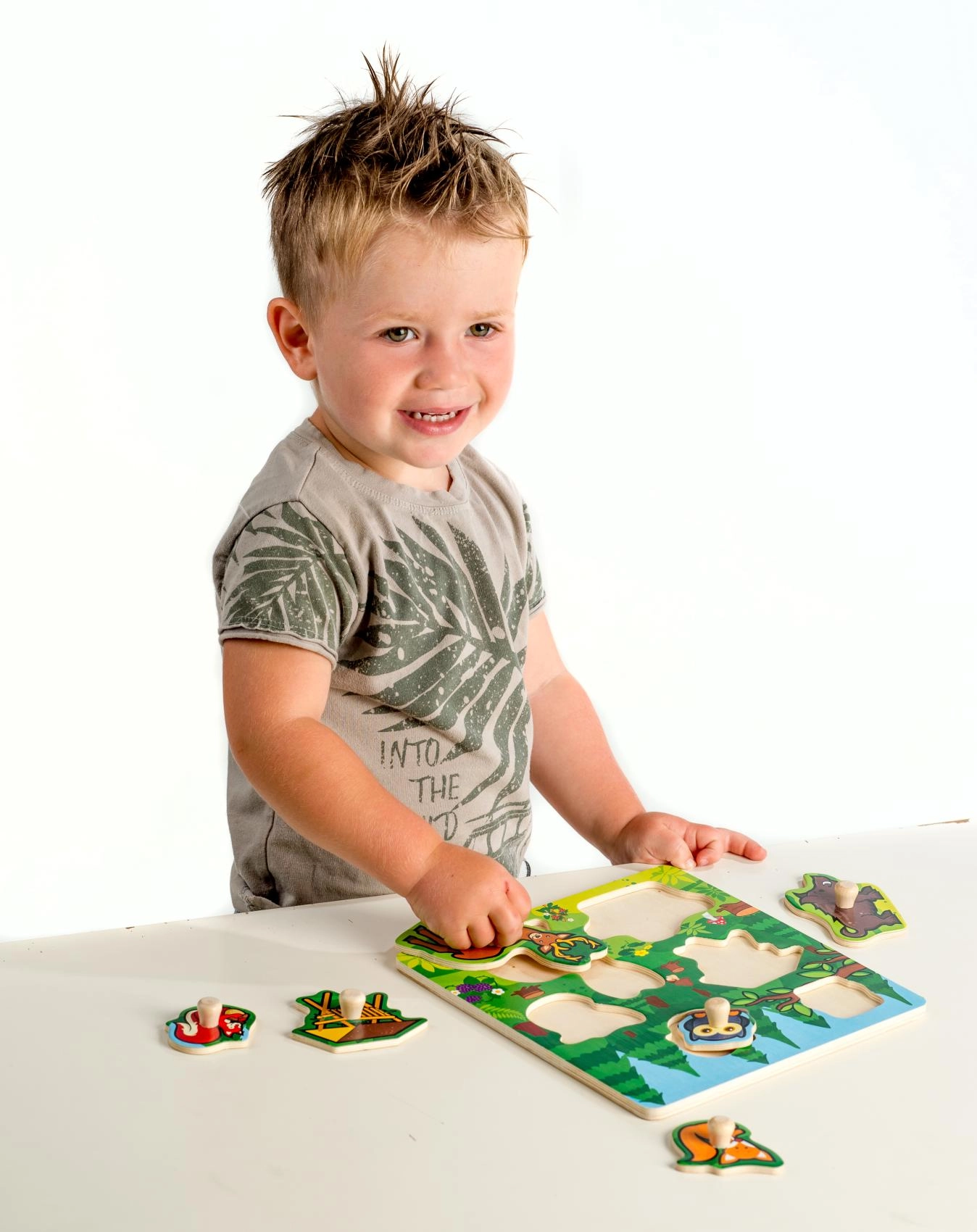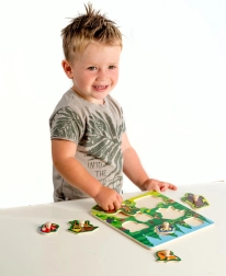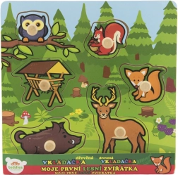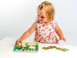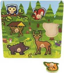 Горските мотиви като бухал, катерица, глиган и елен по забавен начин мотивират към откривателство. Дървената подложка с рамки държи всяко парче на мястото му и улеснява правилното съчетаване по форма и картинка.