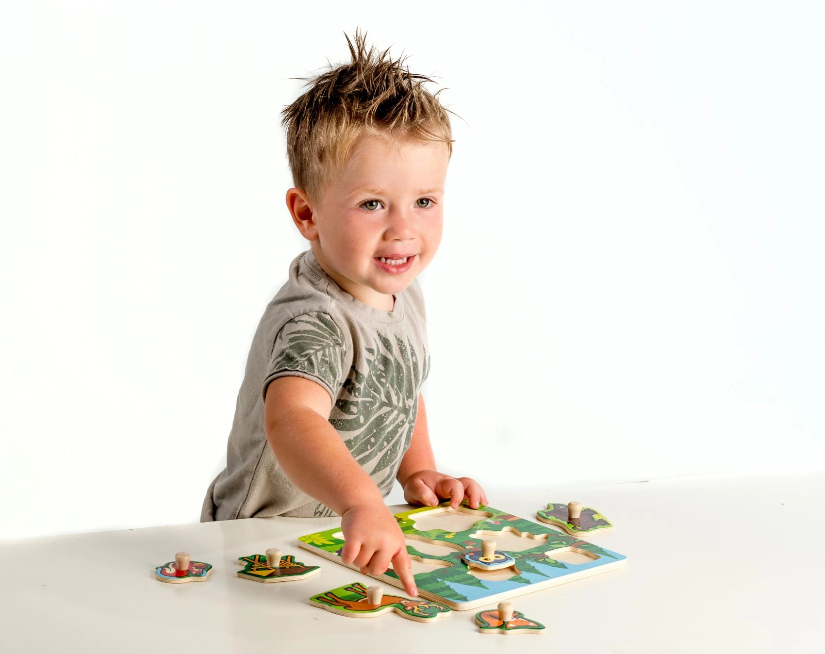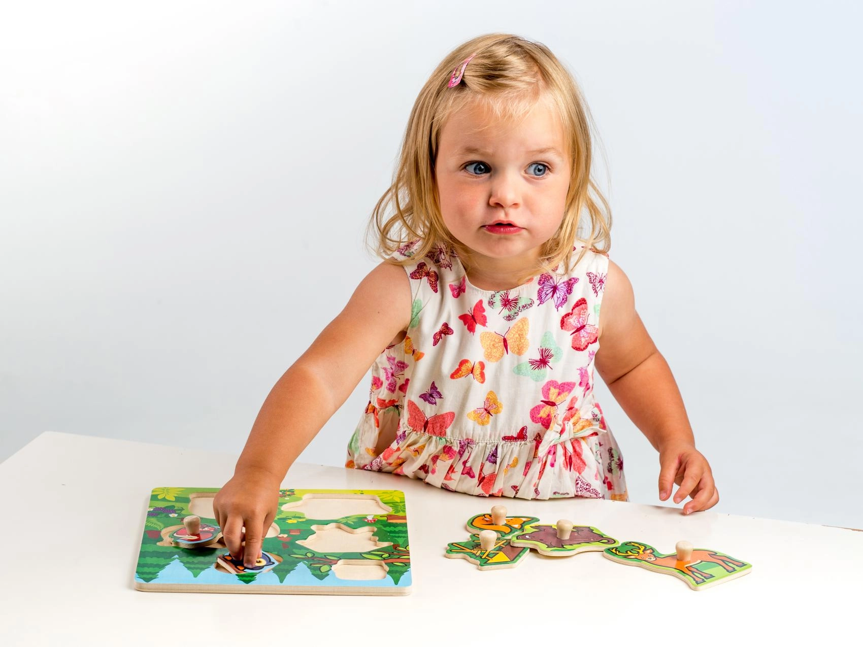Тази качествена дървена вложка е идеалният първи пъзел за деца от 12 месеца. Благодарение на ясните контури и практичните дървени дръжки децата лесно се справят с поставянето на частите, като едновременно тренират хвата, вниманието и търпението.