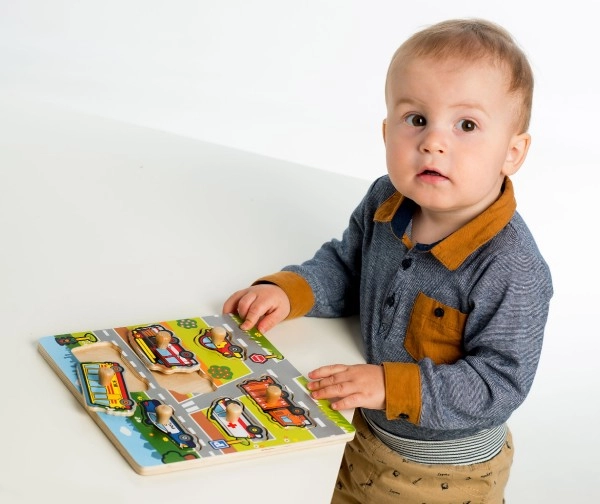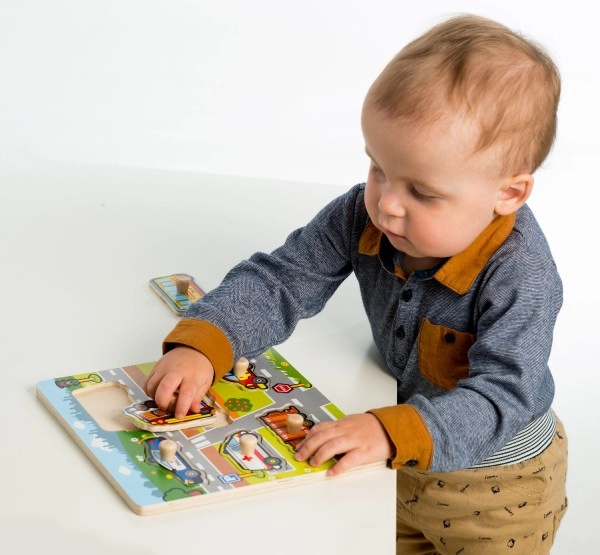 Всеки от шестте вмъкваеми елемента представя различно превозно средство: полицейска кола, автобус, линейка, пожарна кола, сметосъбиращ камион и лек автомобил. Подреждането е лесно благодарение на дървената основа и дръжчиците, които улесняват манипулирането с частите от малките ръчички.