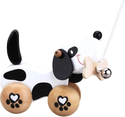Кученцето е на колелца с мотив на лапички, а опашката му се върти при движение, което добавя игривост. Забавлението се подсилва от звънчето, което стимулира слуховото възприятие на децата. Оборудвано е с връзка, закрепена за кокал в муцуната, което позволява лесно дърпане. Играчката е подходяща както за игра у дома, така и навън.