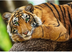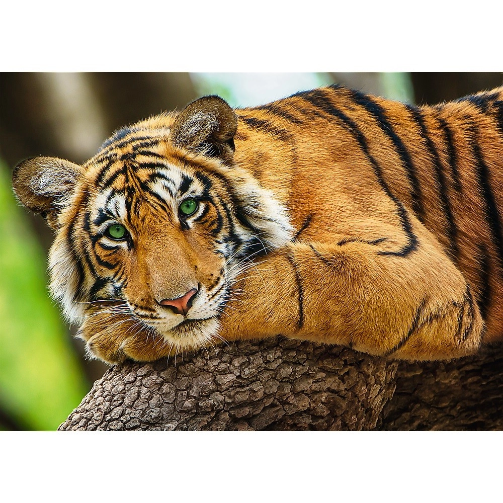 Този пъзел представя реалистичен портрет на тигър, който впечатлява с наситени цветове и фини детайли. Календирана хартия с екологични бои на хранителна основа осигурява високо качество и безопасност при подреждане.