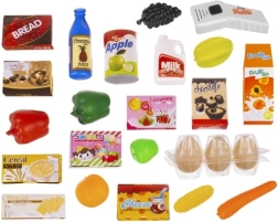 В комплекта има цветни плодове и зеленчуци, напитки, сладки, яйца и кутии с храни. Реалистичните аксесоари подпомагат ученето чрез игра, разпознаването на продуктите и сортирането. Стабилната пластмасова изработка е устойчива и безопасна за ежедневна игра.