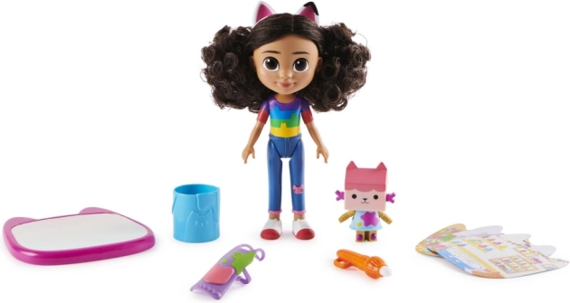 Влезте в света на GABBY'S DOLLHOUSE с красивата кукла Габи с котешки ушички и забавен комплект за рисуване с вода. Достатъчно е да напълните кофичката, да намокрите четката и да творите – изображенията изчезват след изсъхване, така че можете да рисувате отново и отново. Идеално за креативна игра без бъркотия.