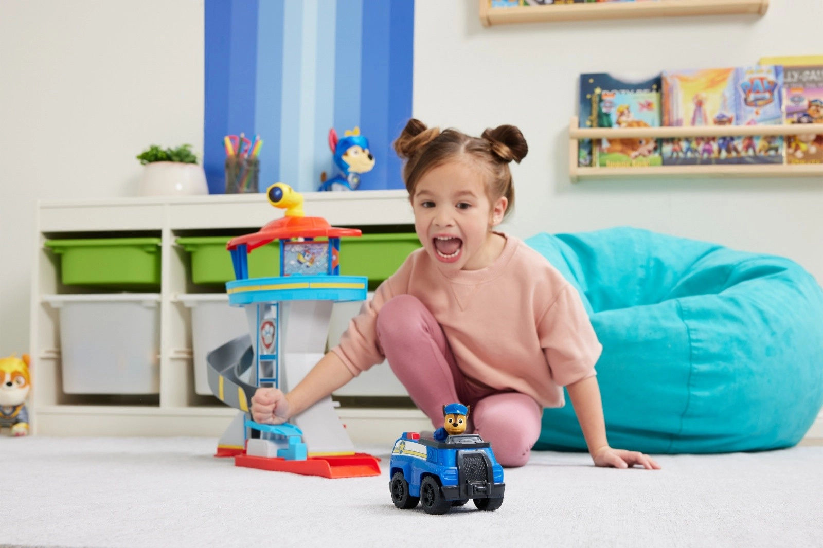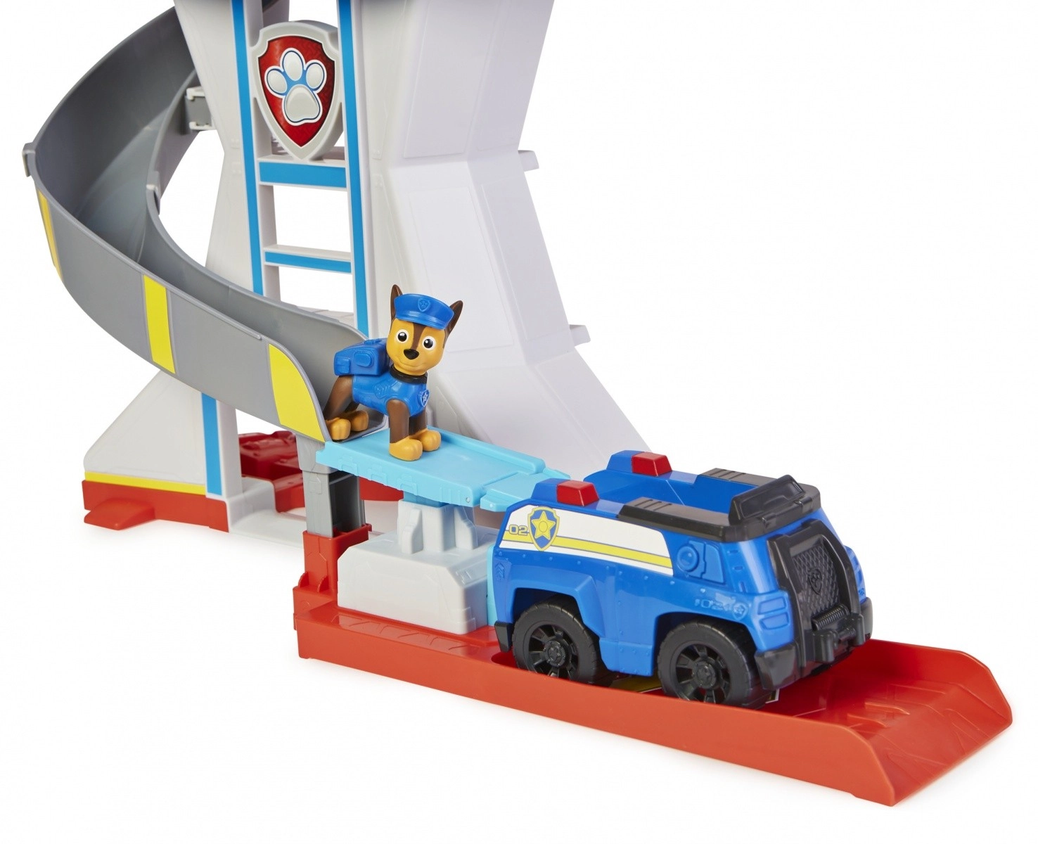 Поставете Чейс в цивилно в предната част на асансьора, а Чейс-герой – в задната. Повдигнете асансьора и вижте как Чейс в цивилно се превръща в Чейс-герой. На върха на кулата изберете една от 3-те двустранни карти с мисии и разберете задачата за деня. Когато е време за спасителна акция, спуснете се по пързалката директно в полицейската кола на Чейс и тръгнете в действие с натискане на стартера за коли. За още повече забавление можете да събирате и други кученца като Маршъл, Скай и Ръбъл заедно с техните превозни средства.