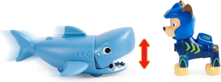 Фигурката на Чейс е облечена в нов неопрeнов костюм, за да е готова за всяка подводна спасителна акция. Децата могат да закрепят Чейс върху гърба на неговия приятел акула и да активират механизма за захапване с простo движение напред. Автентичните детайли и дизайнът, вдъхновен от сериала „Пес патрул“, позволяват на децата да се забавляват с часове и да откриват креативни спасителни мисии.