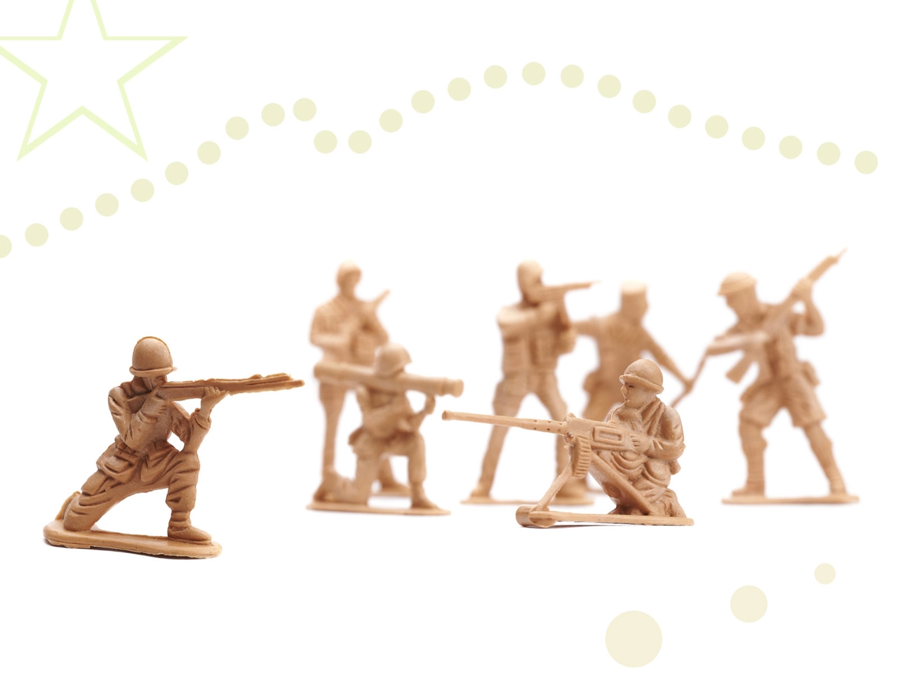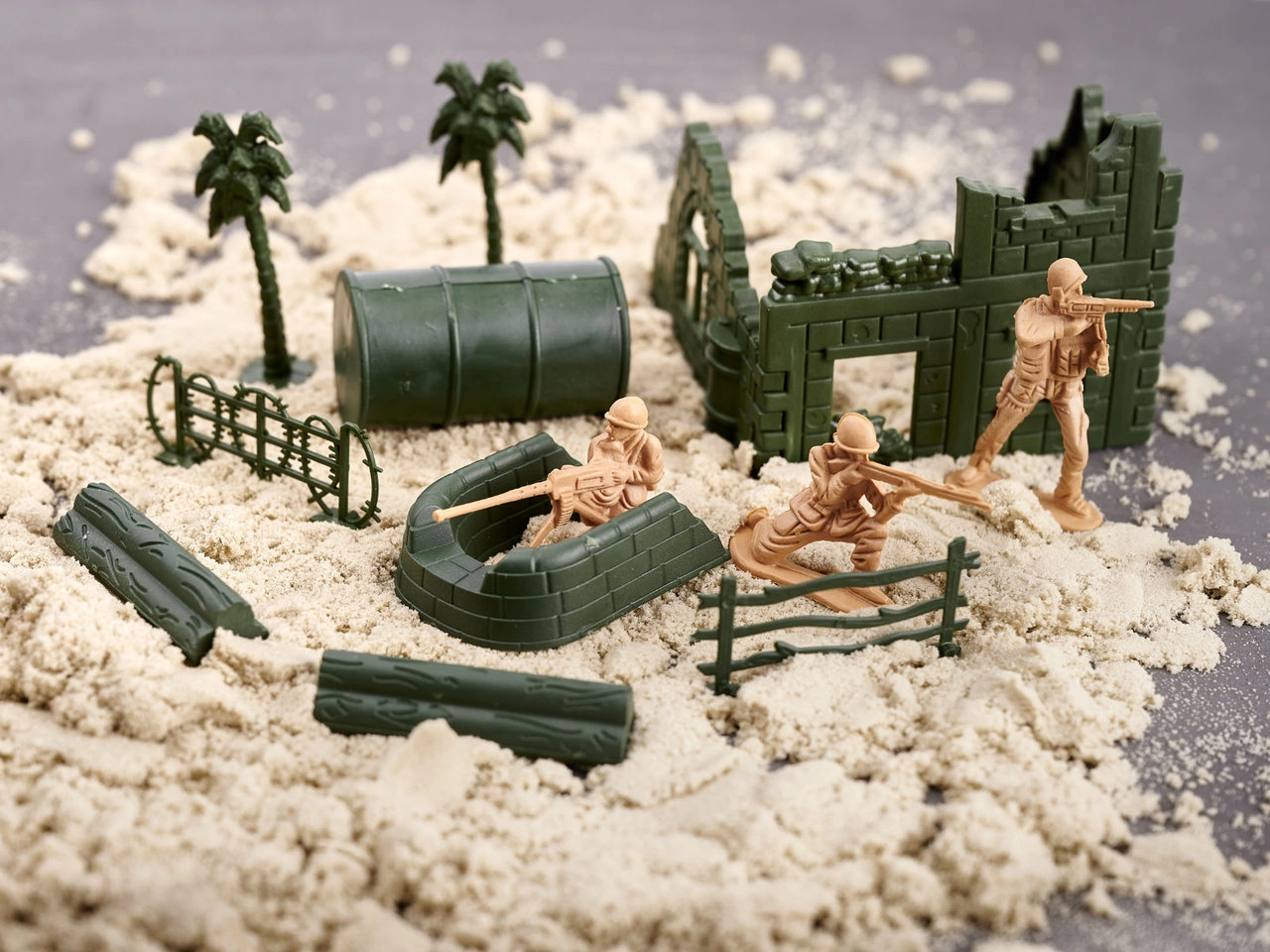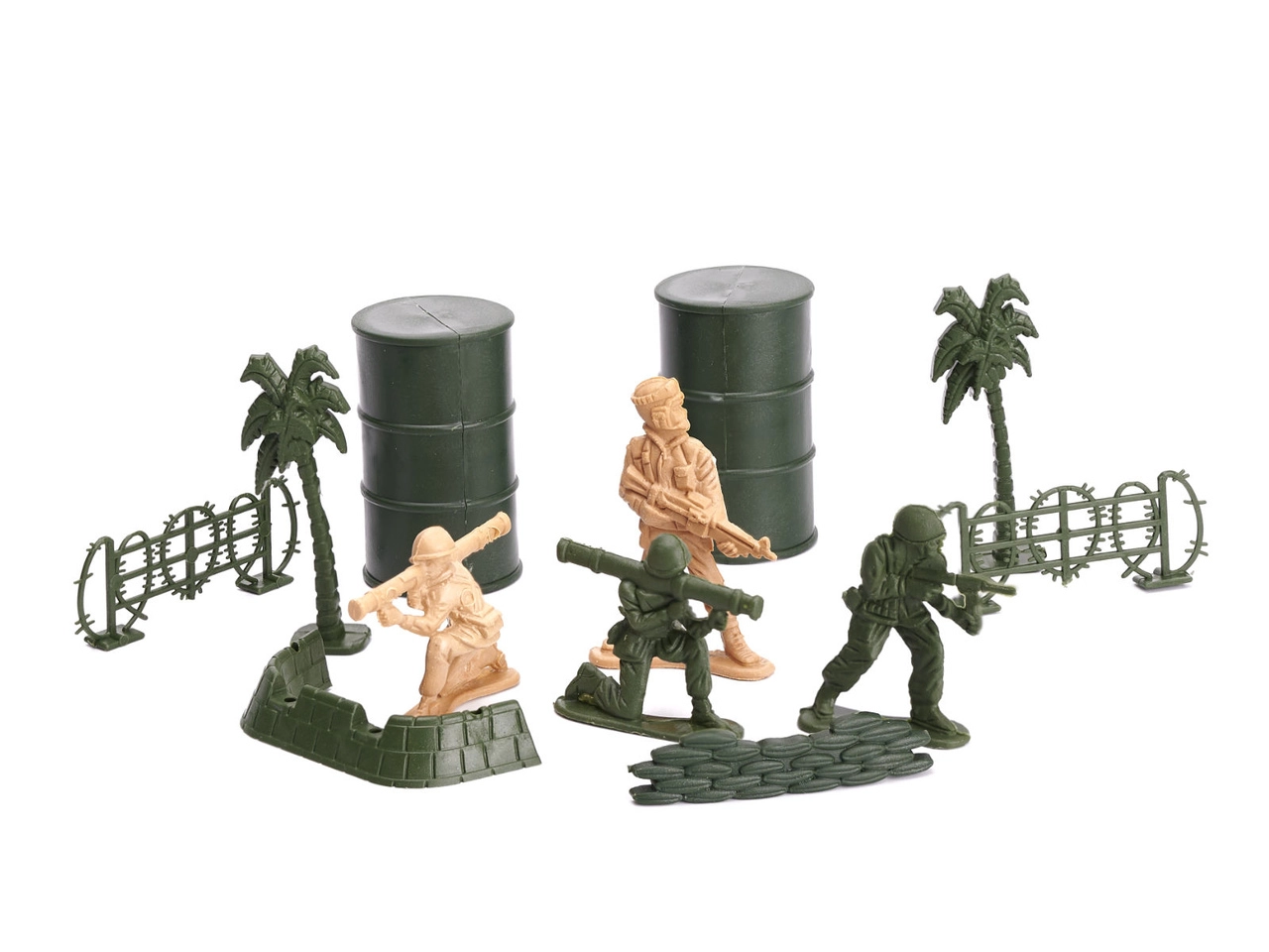 Включени са приблизително 60 фигурки на войници в различни пози и богати компоненти за изграждане на военна база – варели, огради, препятствия, палми и други. Фигурките са с височина около 5 cm, стоят стабилно на равна повърхност и се подреждат лесно.