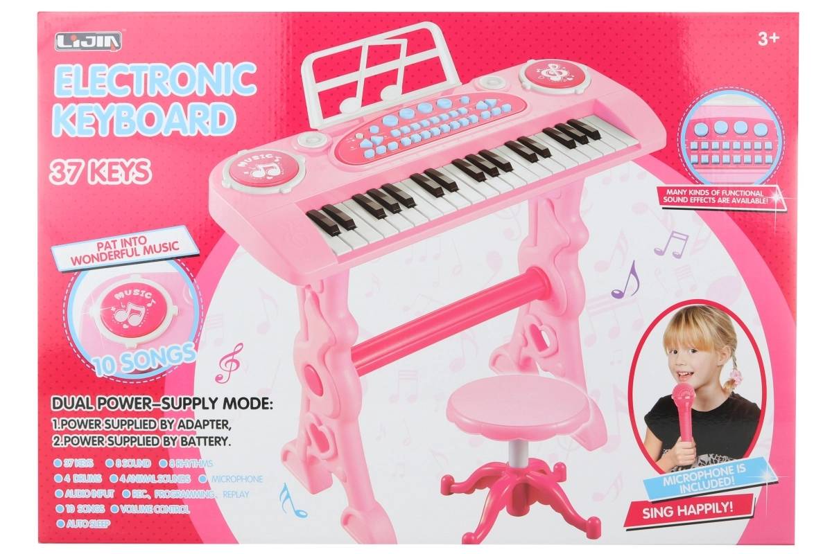 Пианото може да се захранва с адаптер за български тип контакт или с 4 батерии AA (не са включени). С размери приблизително 48 x 53 x 24 cm то лесно се вписва в детската стая.