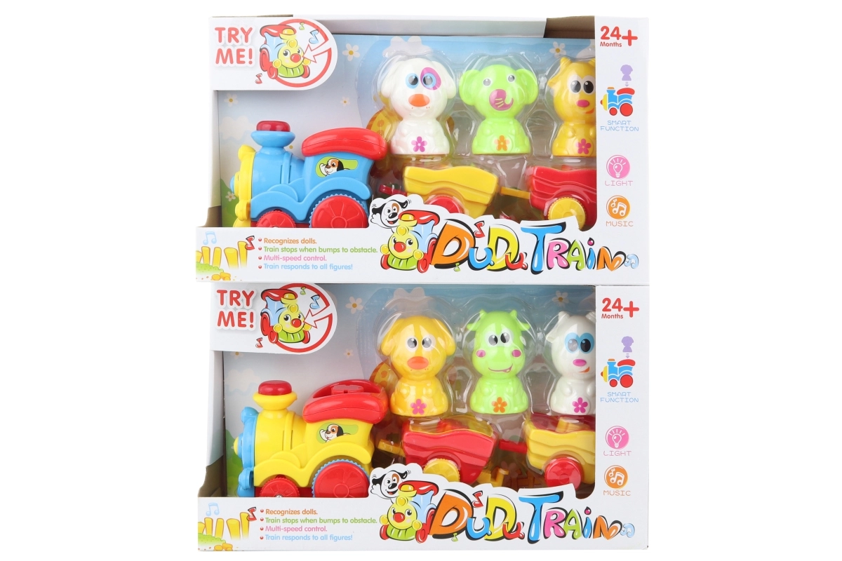 Това цветно детско влакче с животни е идеално за малки изследователи. Движи се, свири/свирка, пуска музика и животните се движат по време на каране. С натискане на едно от животните може да се промени скоростта на влакчето.