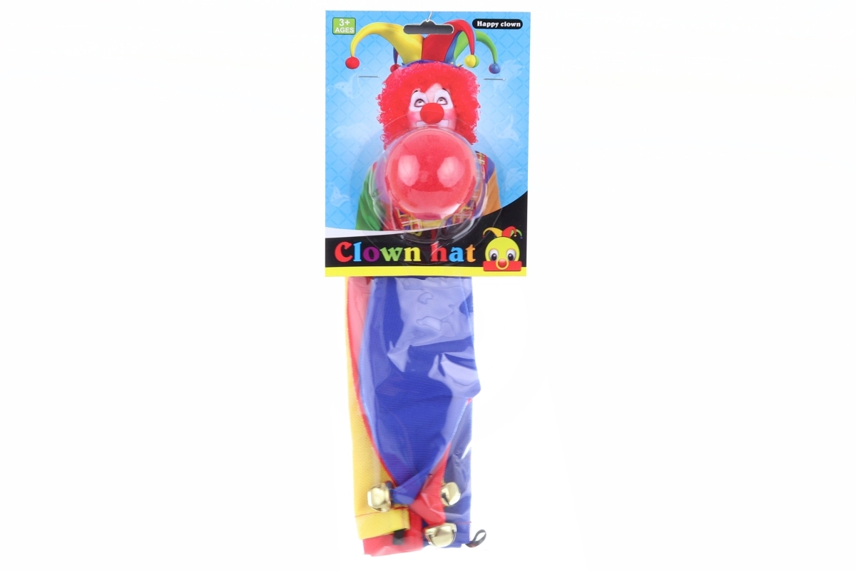 Този цветен комплект превръща всеки за секунди в очарователен клоун. Меката платнена шапка в ярки цветове с метални звънчета добавя игрив звуков ефект към костюма, а червеният пенест нос се поставя лесно и стои удобно.