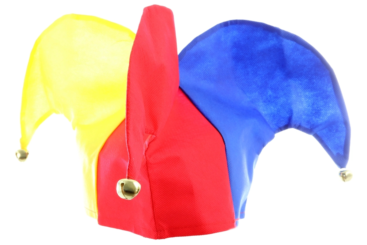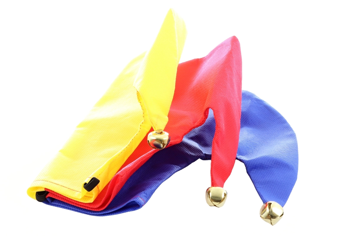 Пъстра клоунска шапка в жълто, червено и синьо с метални звънчета за игрив ефект при всяко движение.