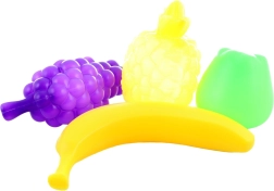 Този цветен комплект плодове включва любими видове като банан, ябълка, портокал, грозде и ананас. Всеки елемент е изработен от лека, издръжлива пластмаса със заоблени ръбове за безопасна игра. Практичната опаковка в мрежичка улеснява пренасянето и съхранението.