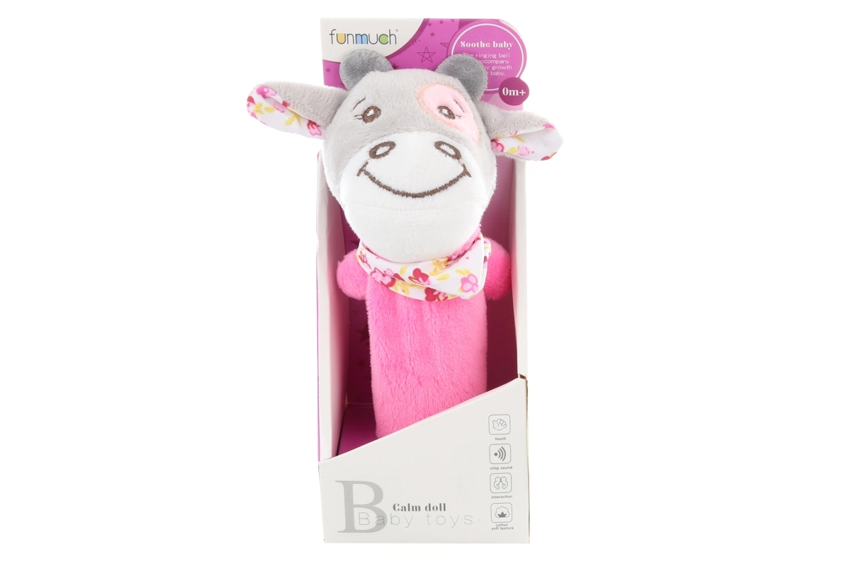 Очарователна плюшена дрънкалка във формата на розова кравичка ще зарадва всяко бебе. Предлага нежен свиркащ звук, приятен плюшен материал и удобно захващане за малки ръчички. Идеална за стимулация на сетивата, развитие на моториката и забавление у дома и по време на път.
