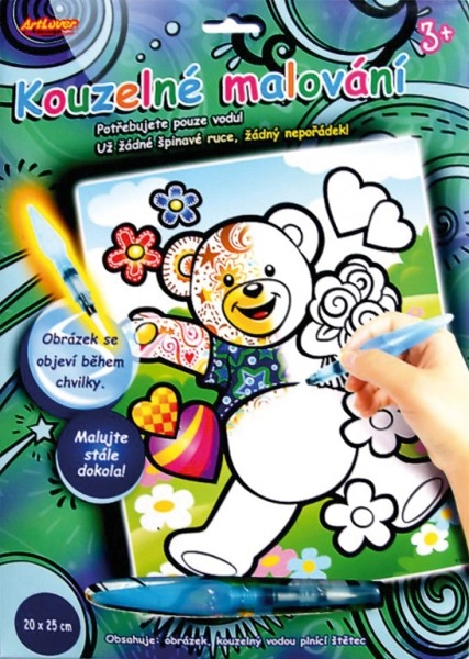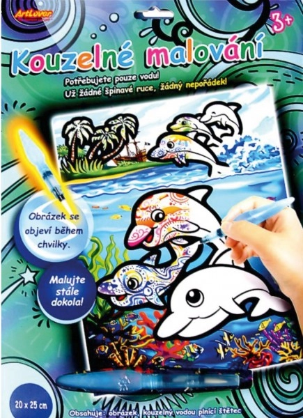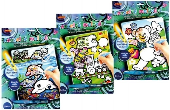 Вълшебното рисуване с вода е идеалният начин да забавлявате вашите малки творци. Нужна е само вода и цветните картинки се появяват веднага щом навлажните специалния бял слой. След няколко минути изсъхване картината отново се покрива с бял цвят, така че можете да рисувате непрекъснато отново и отново.