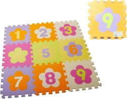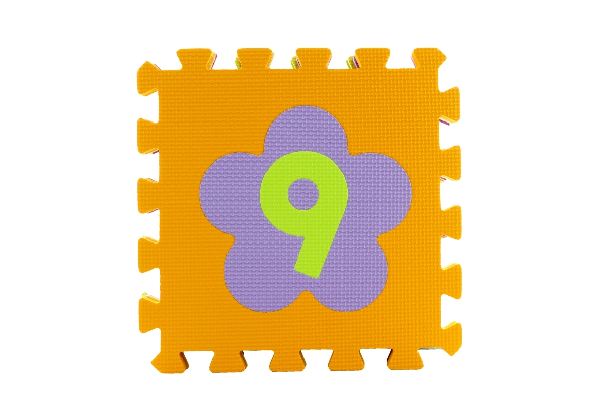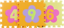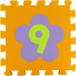 Цветни пенови пъзели с цифри и изваждащи се елементи създават мека и безопасна игрална подложка за деца от 3 години. Елементите с размер 28 × 28 см се свързват лесно, имат релефна неплъзгаща се повърхност, са миющи се, поглъщат шума и изолират от студ. Комплектът съдържа 9 квадратни части.