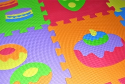 Всеки от 9-те квадратни модула има изваждащи се картинки на храни, които децата могат да подреждат, като така тренират координацията око-ръка и логическото мислене. Пъзелът същевременно намалява шука и топлинно изолира от студения под – перфектен избор за удобно и безопасно играене.