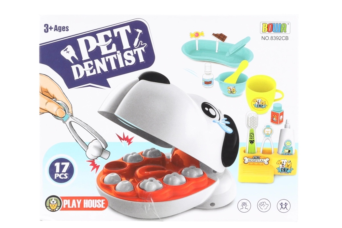 Сладката кучешка глава с отворена уста позволява безопасно и нагледно „лечение“ – преглед, „пробиване“ и „пломбиране“. Осветеното огледалце (с батерии) прави играта по-приятна и по-реалистична. Пластмасовата „шоколада“ и „бонбоните“ служат като чудесно средство за обяснение защо е важно да мием зъбите и да ходим на профилактични прегледи.