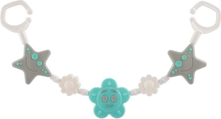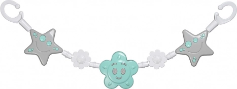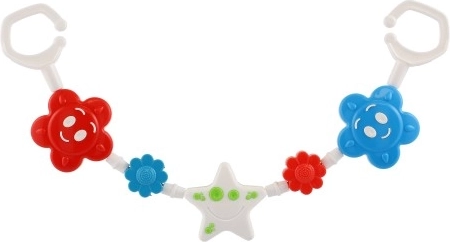 Тази цветна верижна играчка със слънчице и звездички лесно се прикрепя към количка, столче за кола или кошара. Подпомага зрителното възприятие, фината моторика и забавлява бебето по време на път и у дома. Благодарение на издръжливата пластмаса и безопасната изработка е идеална за ежедневна употреба.
