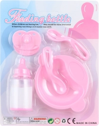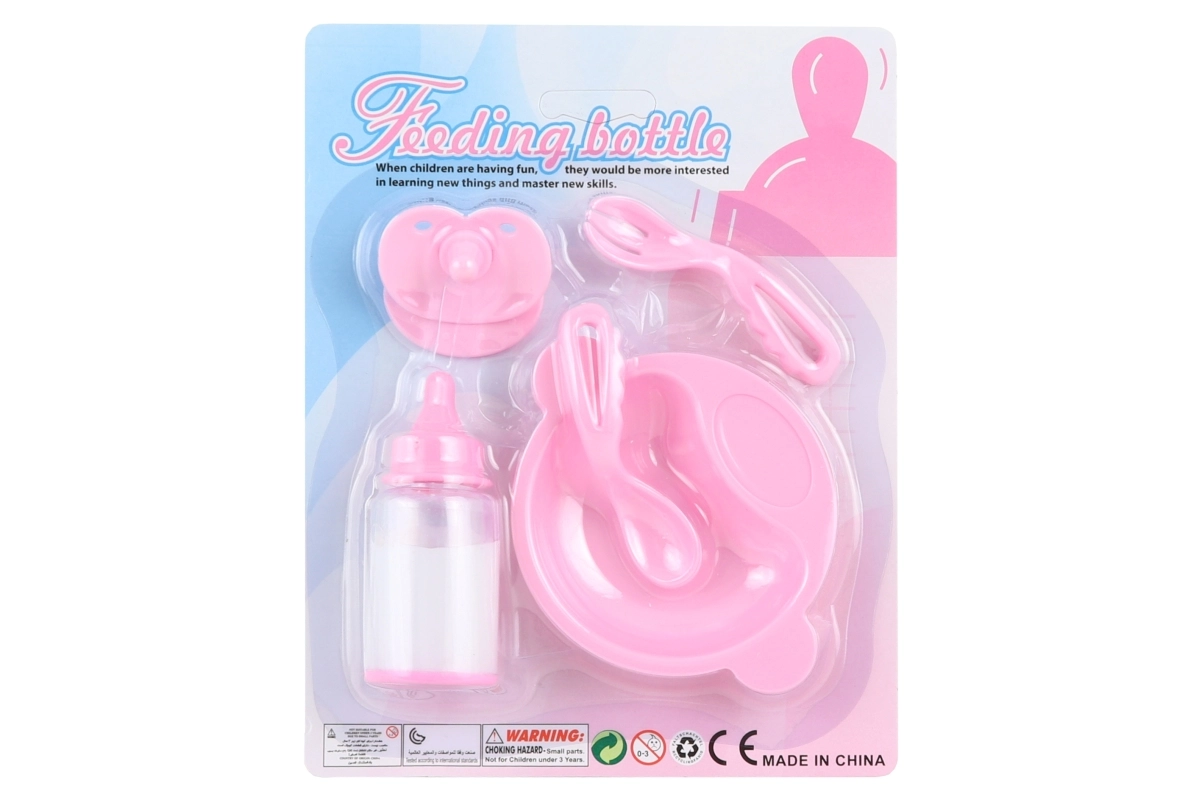 Комплект аксесоари за кукли, идеален за игра на „майка“, включва шишенце, биберон, чинийка и прибори. Перфектно допълнение за всяка малка грижеща се майка.