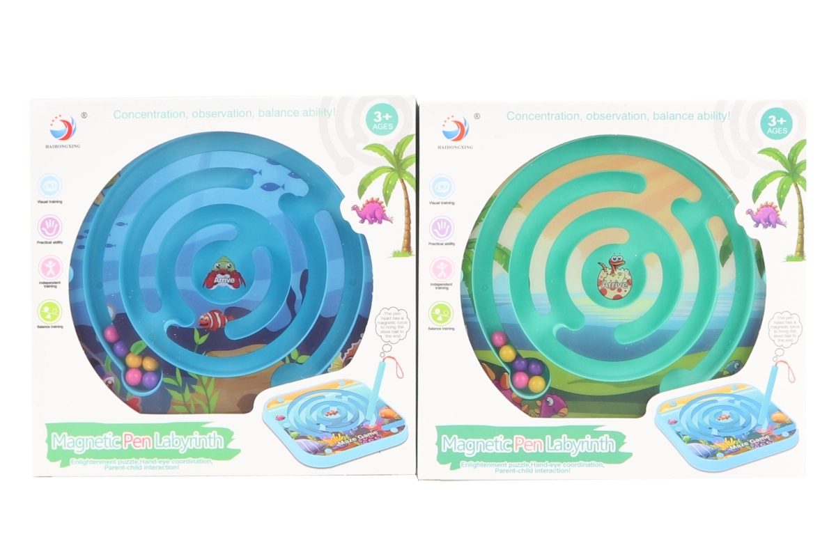 Играта е безопасна и прегледна – топчетата са затворени под прозрачен капак, така че не могат да се разпилеят. Лабиринтът с магнитна писалка е подходящ за предучилищна възраст от 3 години и предлага тиха забава без батерии.