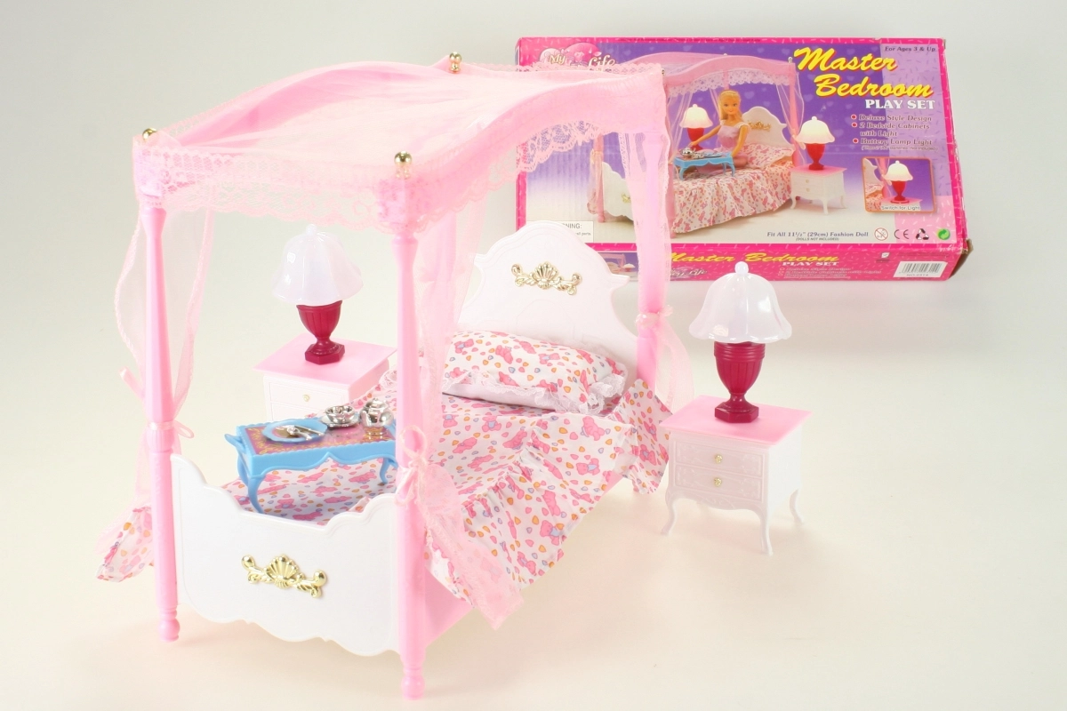 Подарете на куклите луксозен сън с елегантното легло с балдахин GLORIE. Комплектът включва легло с покривало и възглавничка, две нощни шкафчета и две лампички, които при завъртане на цилиндъра се включват. Идеален за креативна игра и стилни къщи за кукли.
