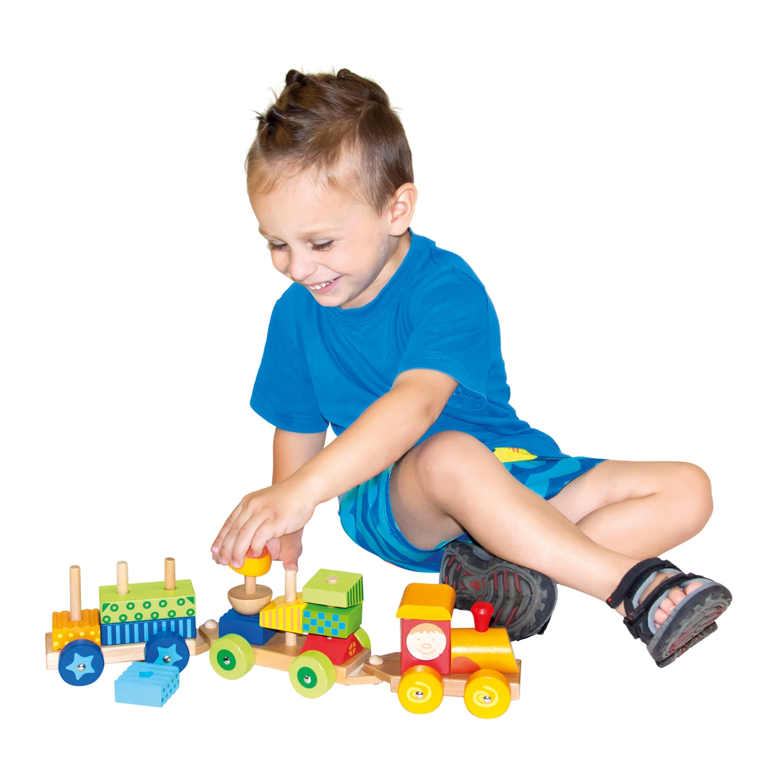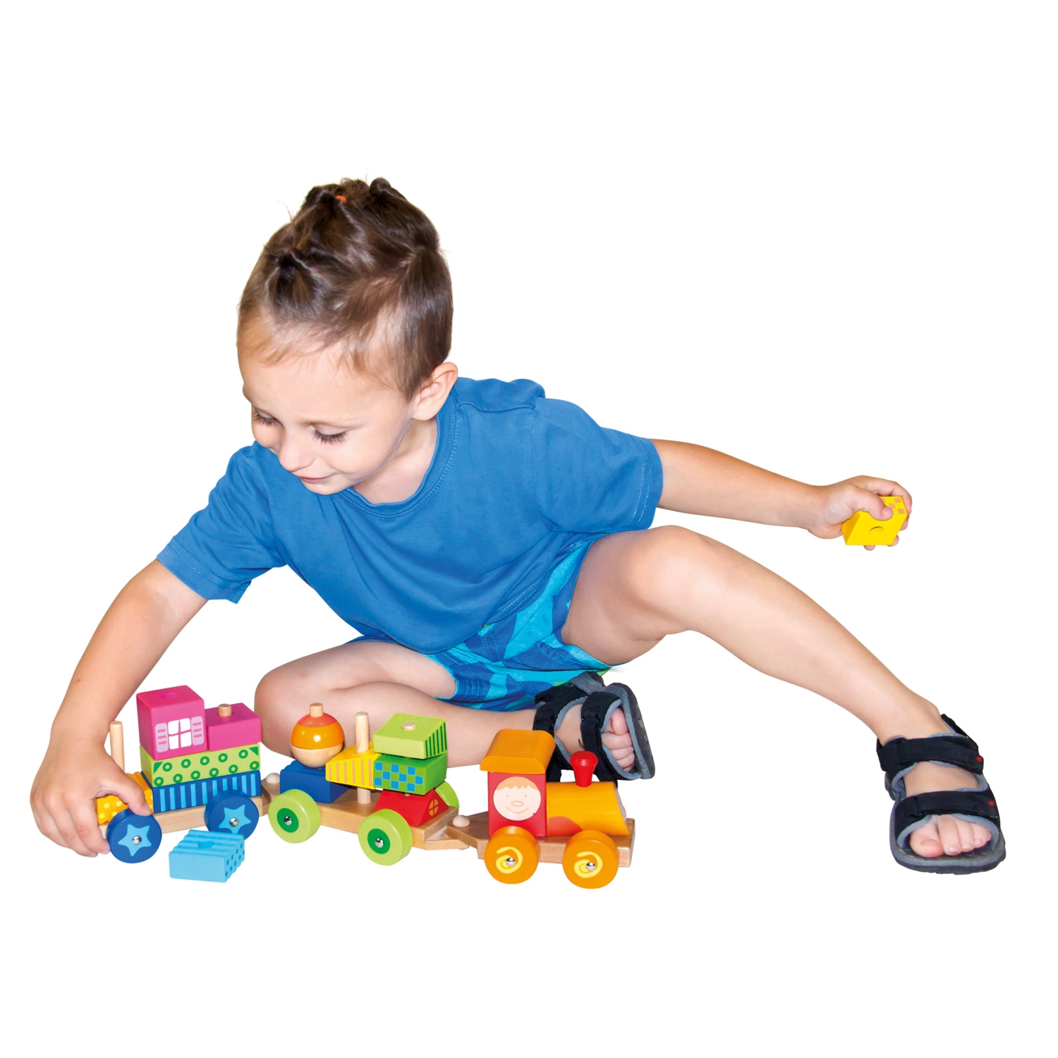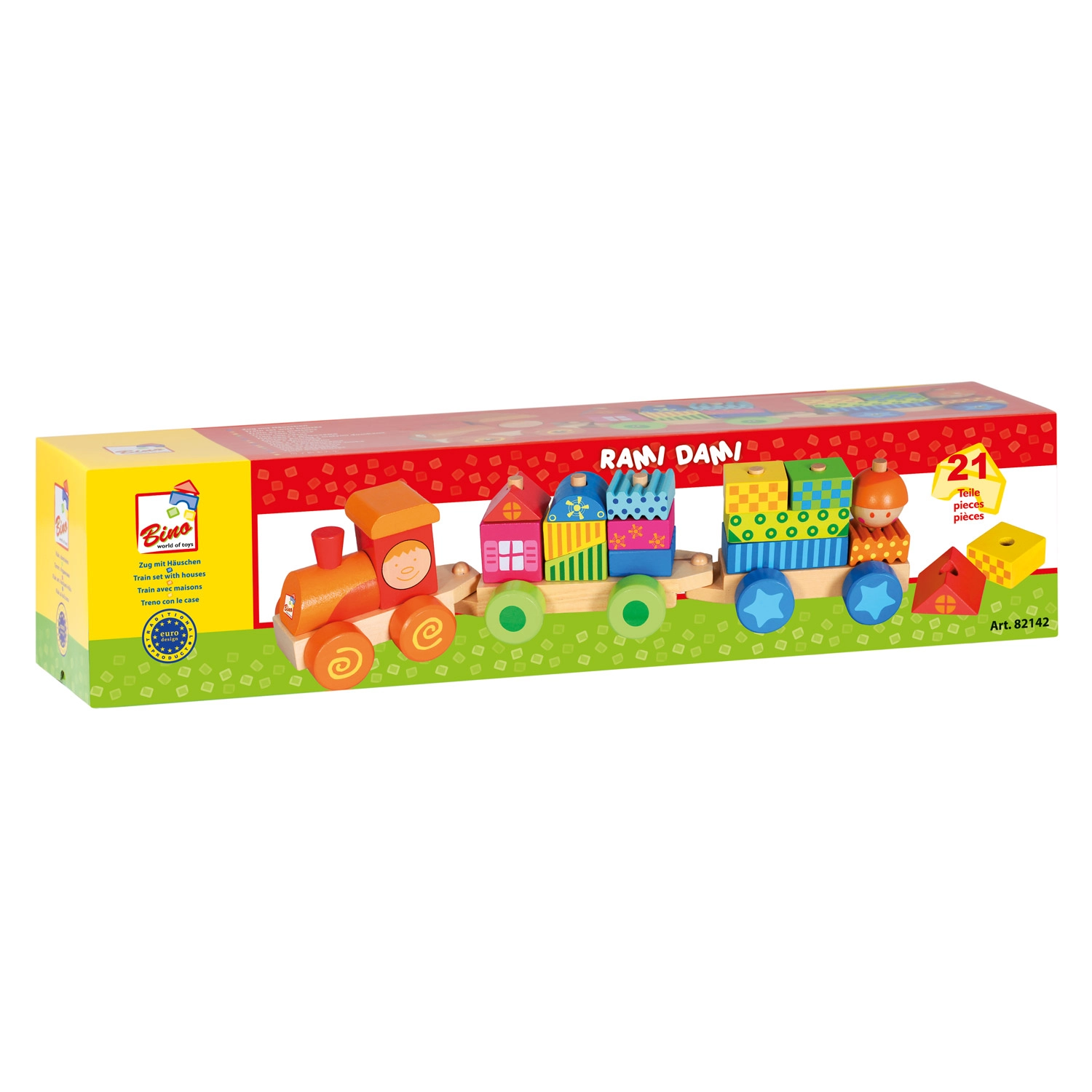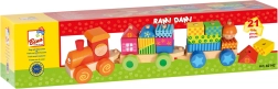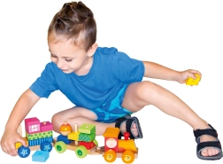 Многофункционалният дървен влак е не само дърпана играчка, но и конструктор, който позволява на децата да развиват своята креативност. Комплектът включва три подвозки и 18 различни кубчета, които могат да се подреждат според фантазията.