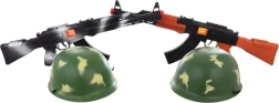 Забавен детски комплект за малки войници, включващ дрънчащ пластмасов автомат с дължина около 53 cm и военна каска с вътрешен диаметър около 18,5 cm. Страхотен избор за игра на войници, развитие на въображението и екшън приключения. Подходящо за деца от 3 години.