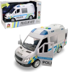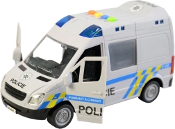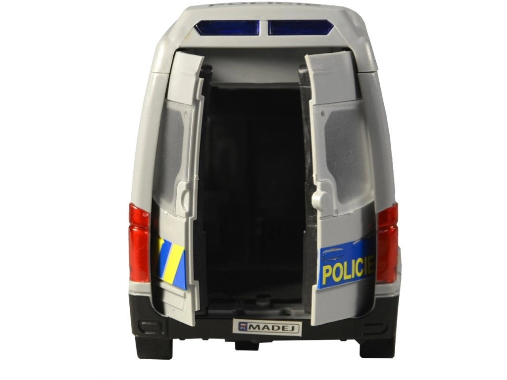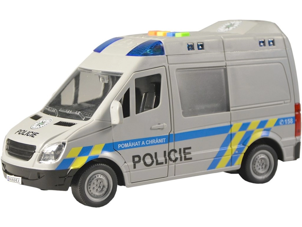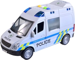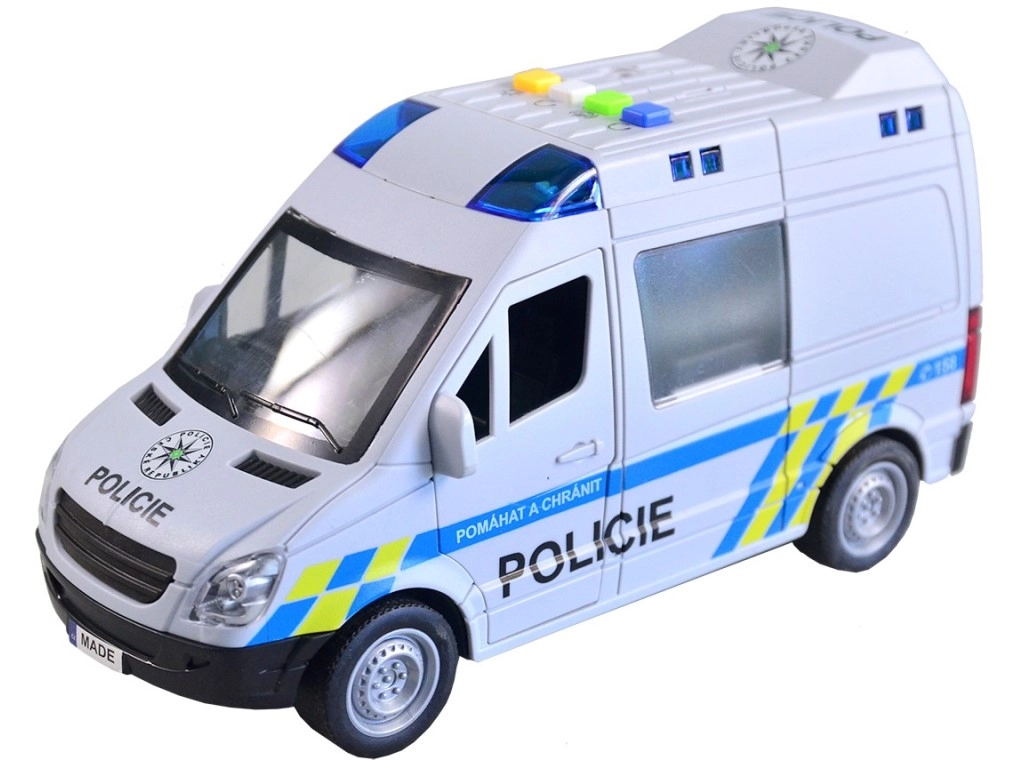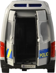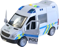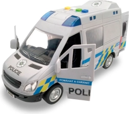 Този полицейски микробус ще зарадва всички деца, които обичат екшън истории и операции. Превозното средство се движи с инерционен механизъм, има светлинен буркан със сини предупредителни светлини и възпроизвежда автентични чешки реплики на екипажа и диспечера, като при истинска полицейска акция. Отварящите се врати подкрепят реалистичната игра и развитието на фантазията.