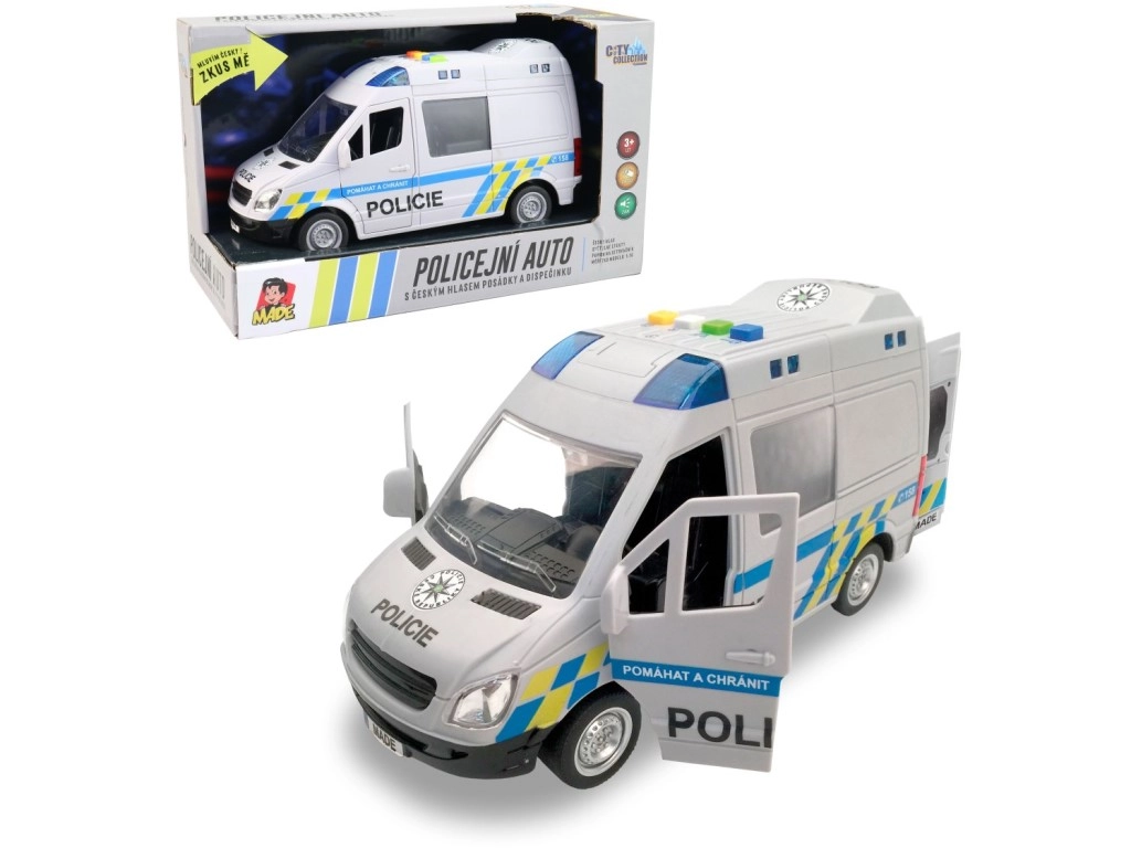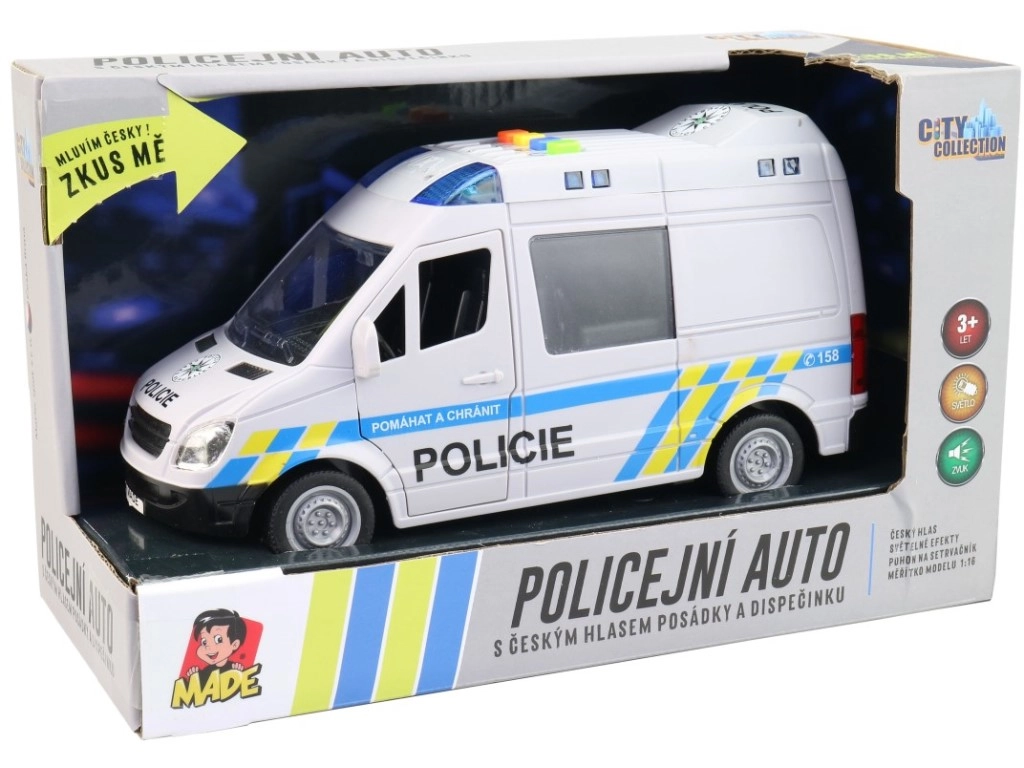 Реалистичен полицейски микробус за малки спасители предлага чешки гласови съобщения на екипажа и диспечера, функционален син буркан и инерционен механизъм. Отварящи се врати и детайлна изработка в мащаб 1:16 гарантират много забавление. Дължината на автомобила е 21 см, захранване 3× 1,5 V AG13. Подходящо от 3 години.