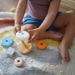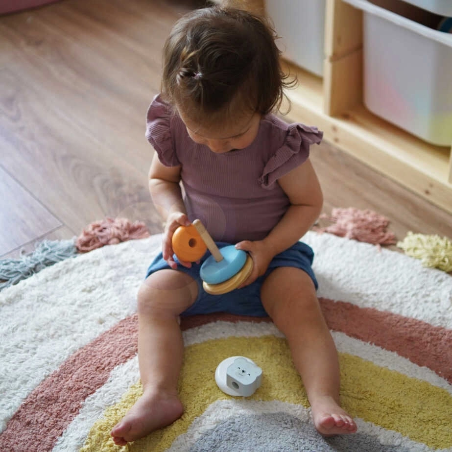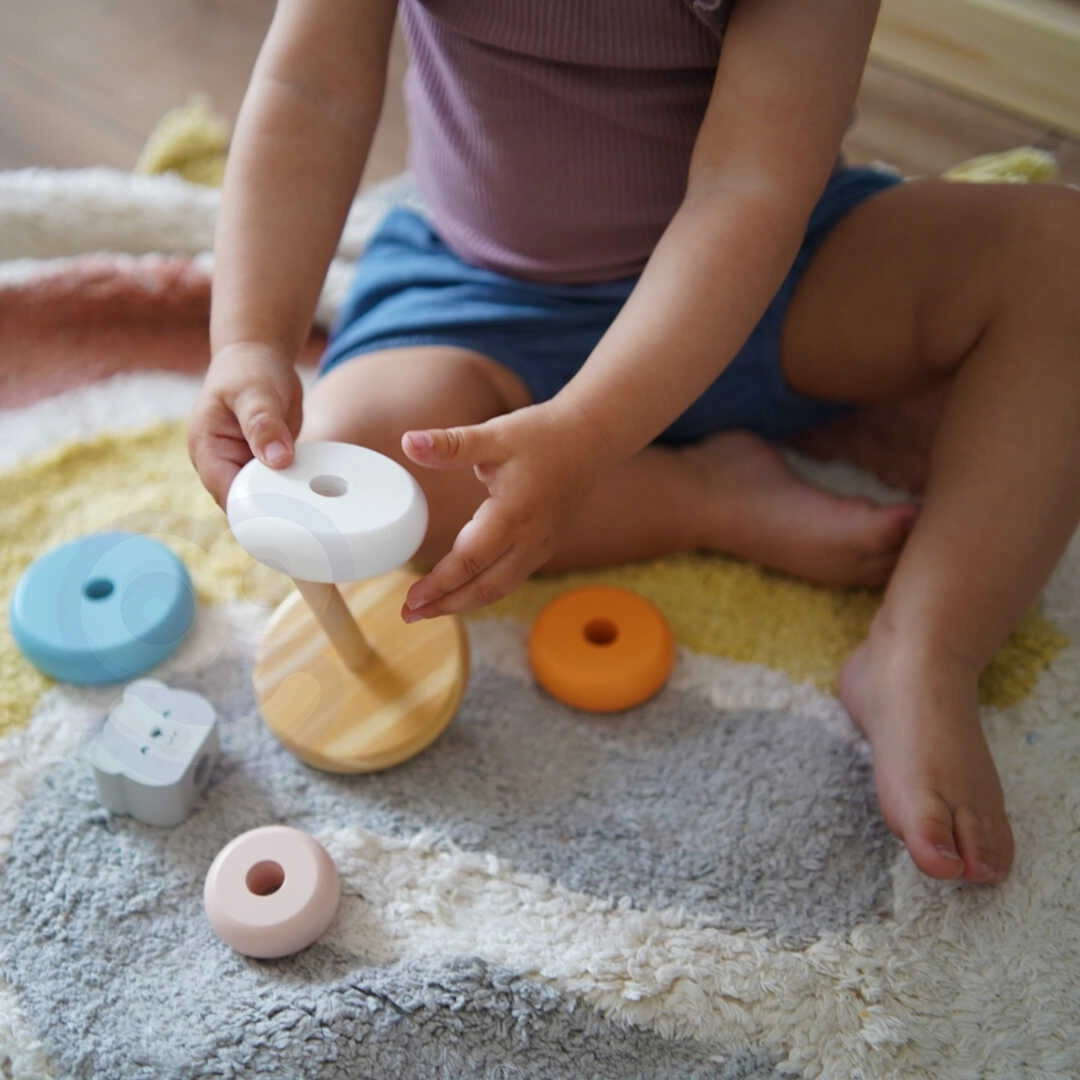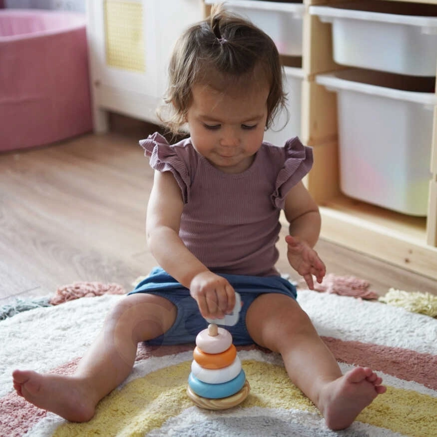 Нанизването на ринговете върху основата не само носи на децата радост, но и развива техните координационни способности и логическо мислене. Децата също се учат да разпознават цветовете и да работят с различни форми.
