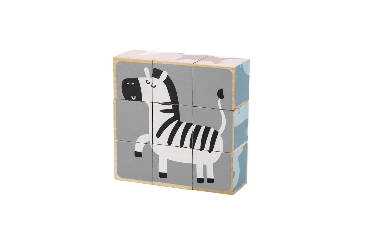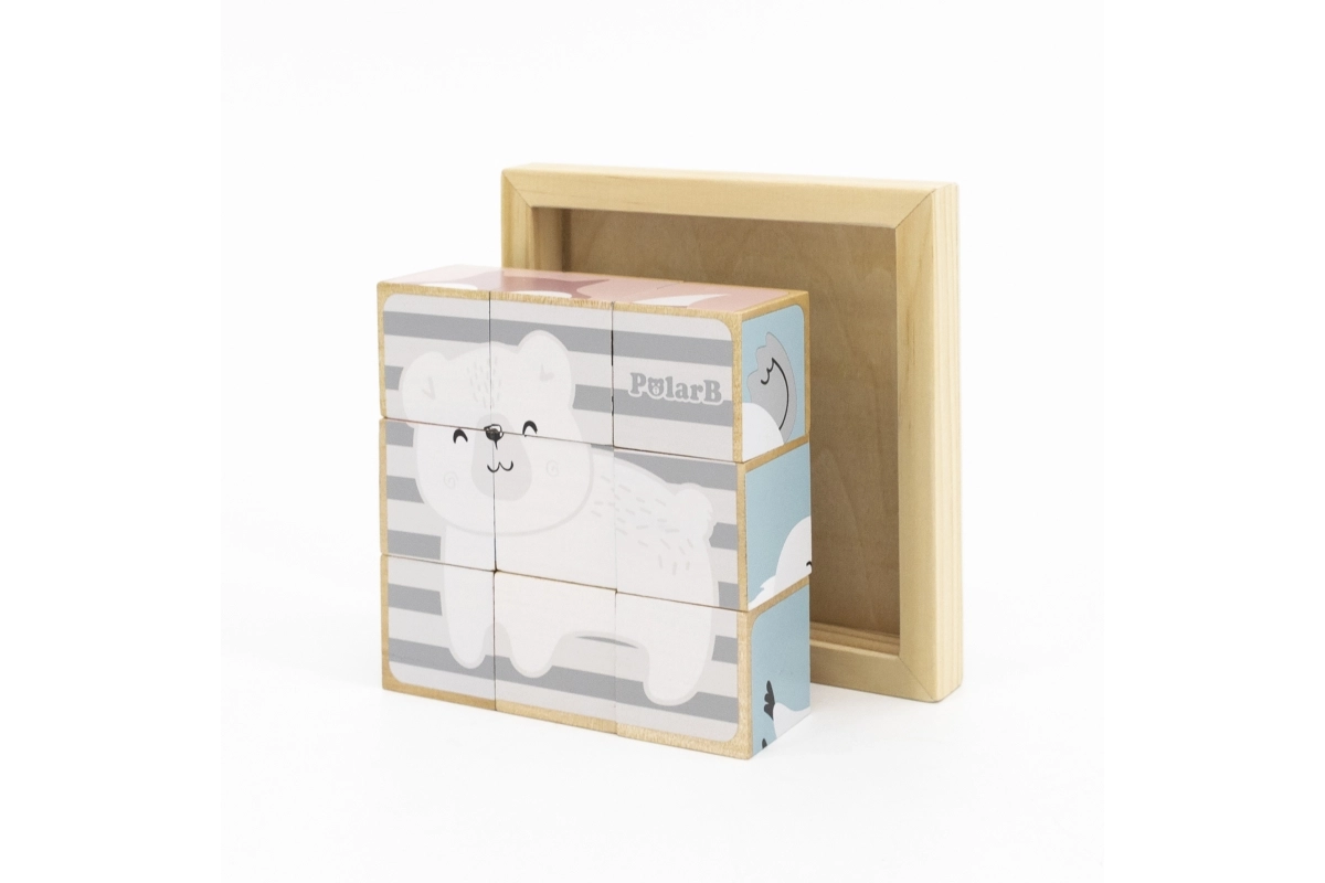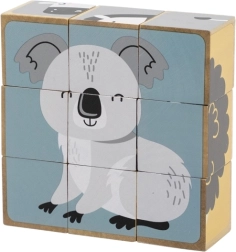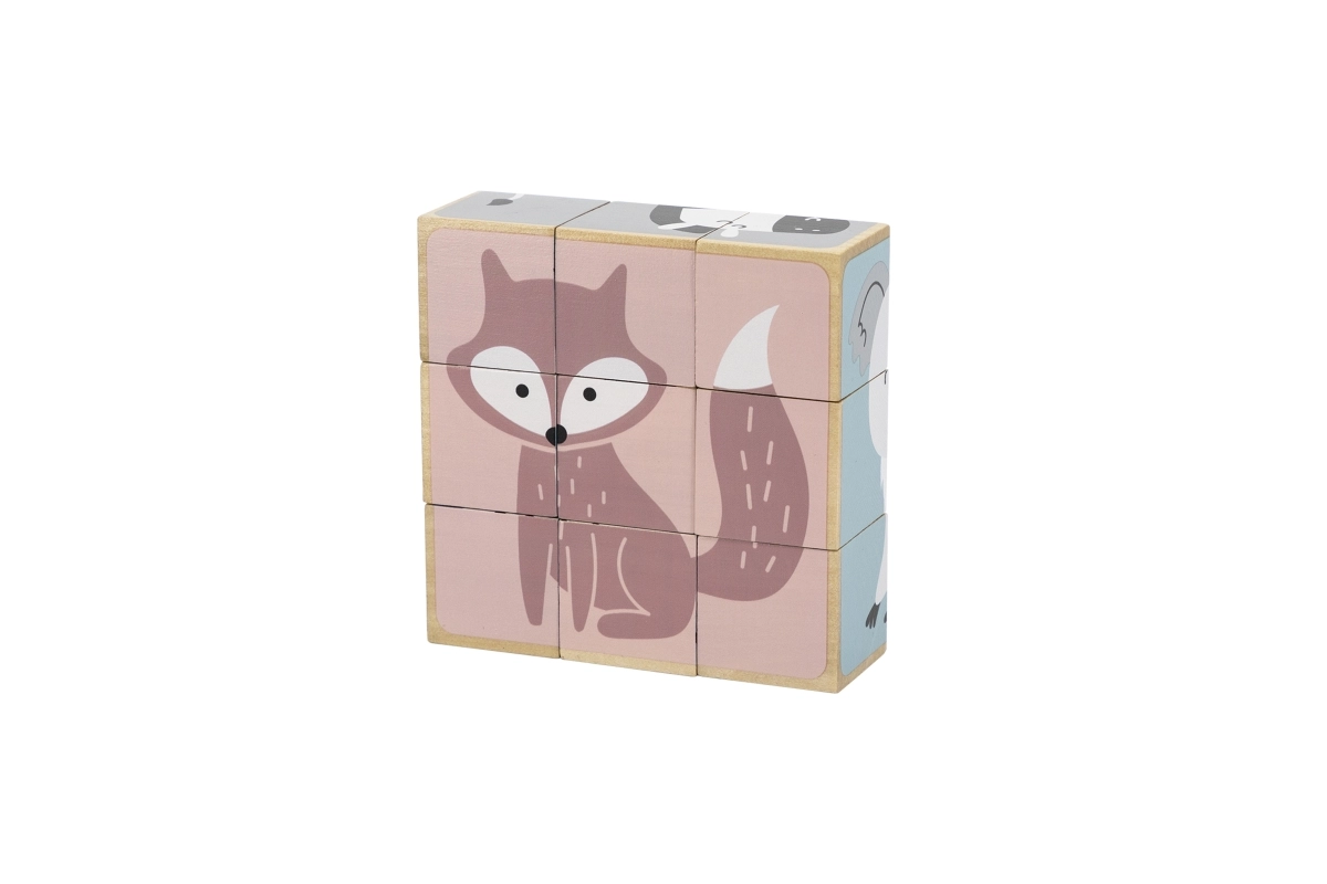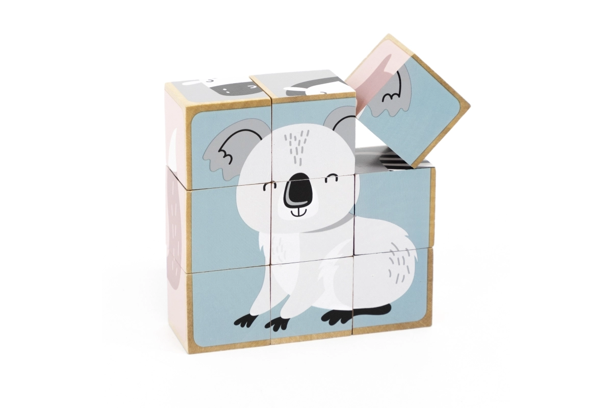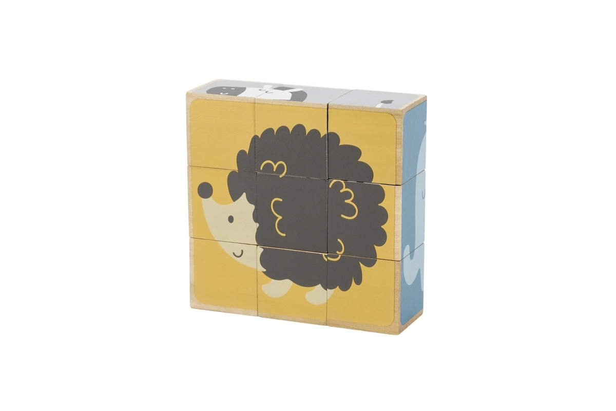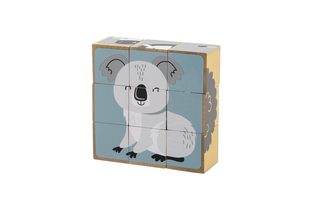 Открийте една непреходна дървена играчка, която едновременно забавлява и учи. От 9 кубчета можете да създадете общо 6 различни мотива с животни – например мече, лисица, коала, зебра или таралеж. Всяка страна на кубчето принадлежи към различна картинка, така че децата ще упражняват вниманието, търпението и пространственото въображение.