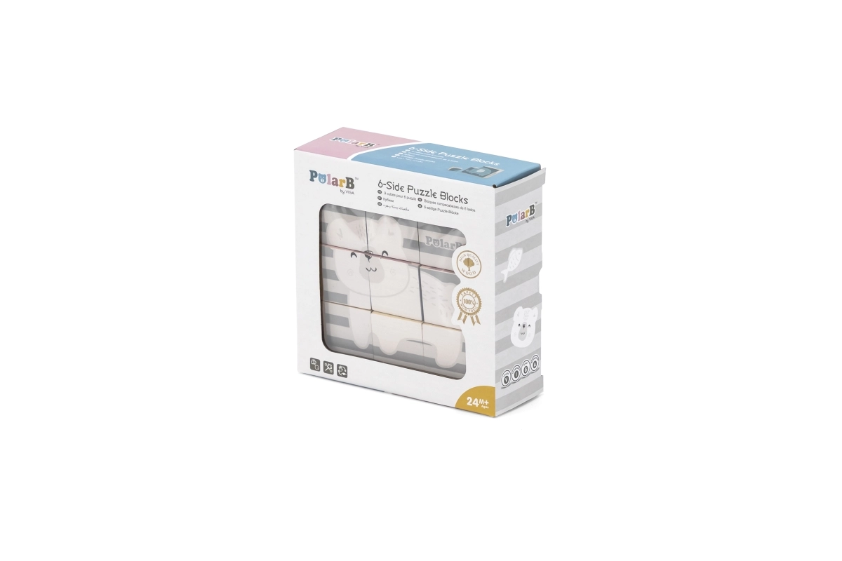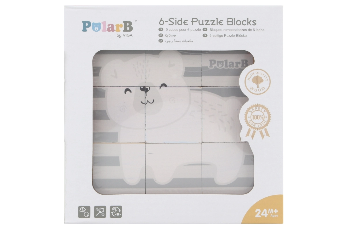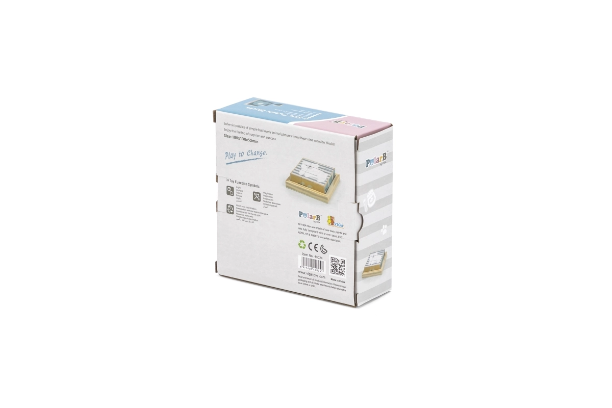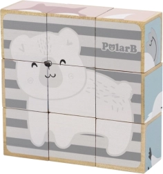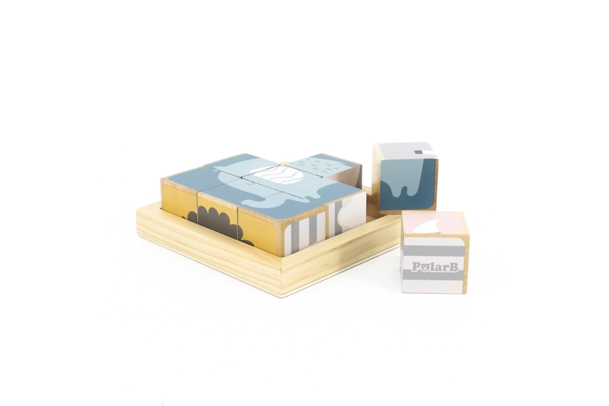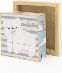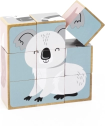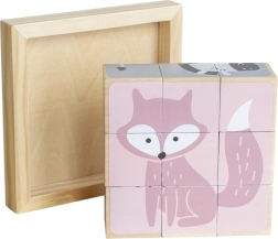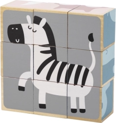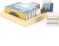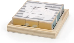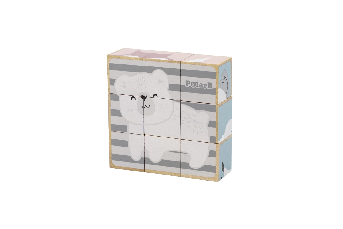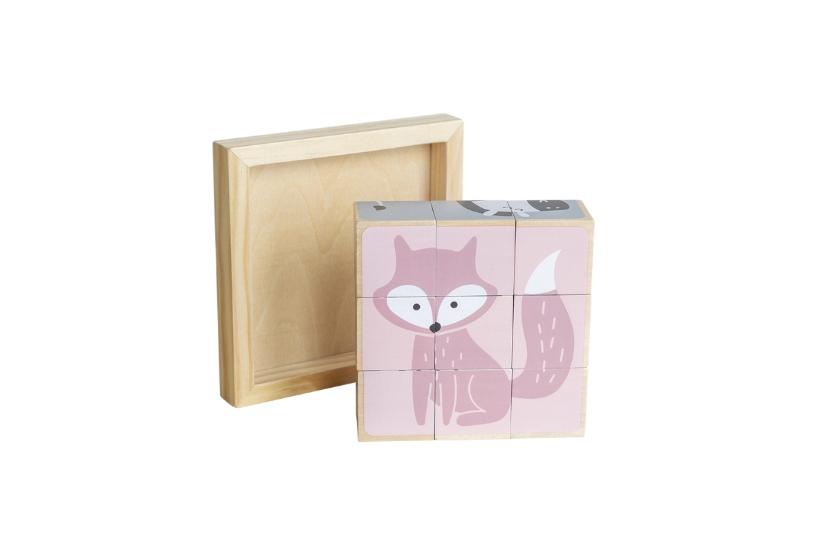 Открийте една непреходна дървена играчка, която едновременно забавлява и учи. От 9 кубчета можете да създадете общо 6 различни мотива с животни – например мече, лисица, коала, зебра или таралеж. Всяка страна на кубчето принадлежи към различна картинка, така че децата ще упражняват вниманието, търпението и пространственото въображение.
