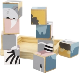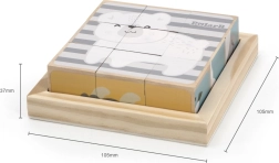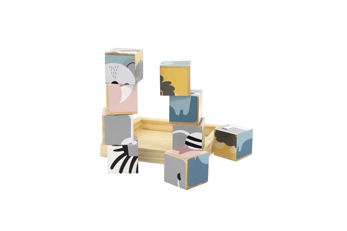 С тези висококачествени дървени кубчета ще подредите до 6 сладки картинки с животни. Деветте масивни и здрави кубчета са идеални за деца от 2 години и развиват фината моторика, логическото мислене и визуалното възприятие. Безопасно изпълнение, приятни пастелни цветове и издръжлива конструкция за ежедневна игра.