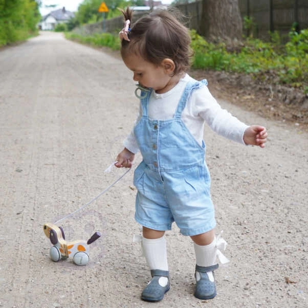 Кученцето за дърпане мотивира децата да ходят, укрепва координацията и ги учи да пазят равновесие. Благодарение на удобната връв воденето е естествено и забавно.