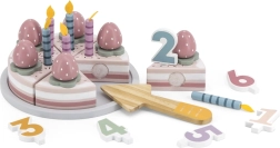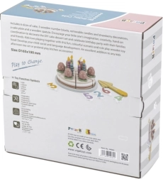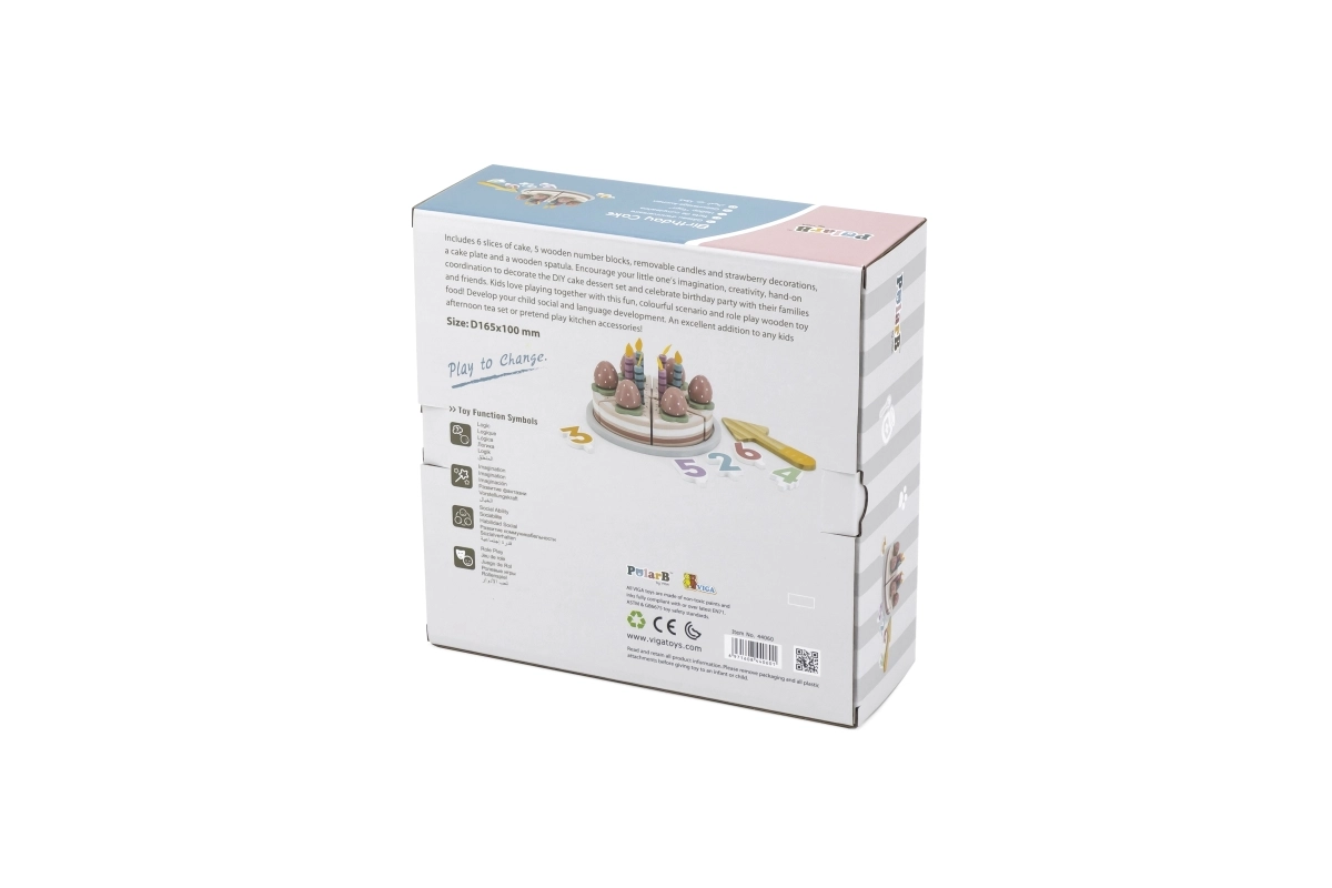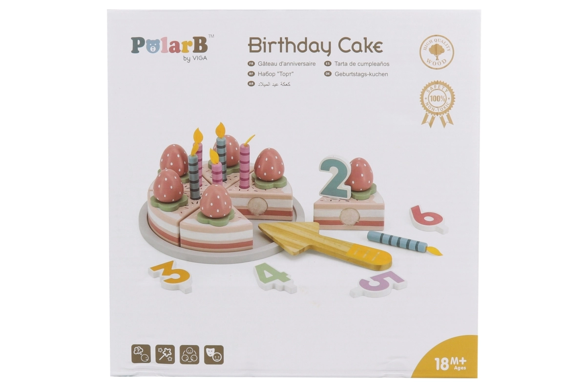 Очарователната дървена торта за рязане от марката VIGA от колекцията POLARB носи часове креативна игра и учене чрез игра. Състои се от 6 парчета торта, свалящи се свещички, ягодки, чиния, дървена шпатула и цифрови кубчета за първо броене. Изработена е от висококачествено дърво и боядисана с нетоксични бои – безопасен избор за малките готвачи.