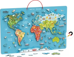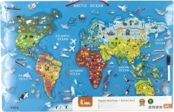 С тази 2в1 образователна дъска децата не само рисуват, но и откриват света чрез магнитни елементи, които изобразяват континенти, превозни средства и морски обитатели. Картата е на английски език, което спомага за изучаване на английски по време на игра. Дъската съдържа 106 елемента и е отличен помощник за развитие на разнообразни умения.