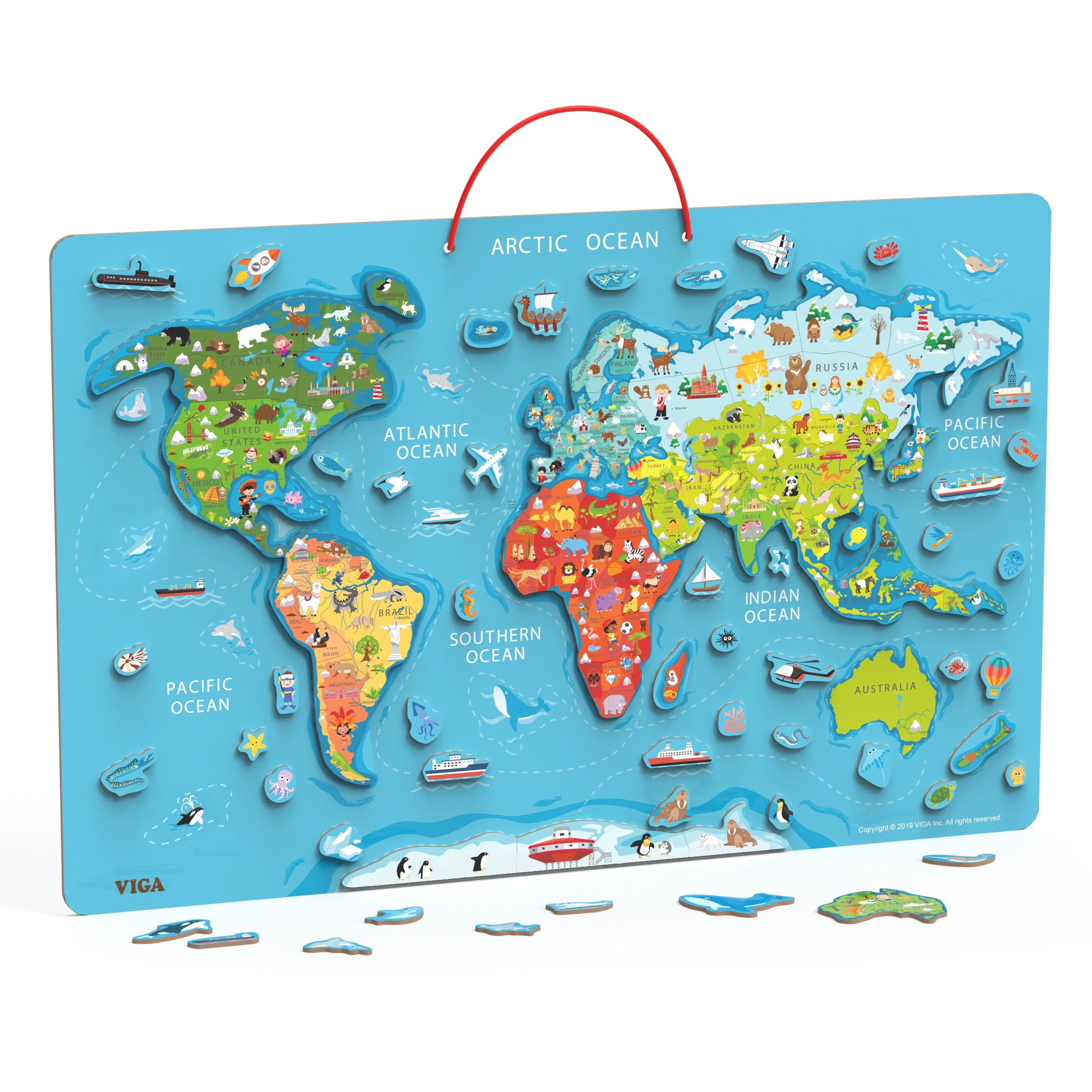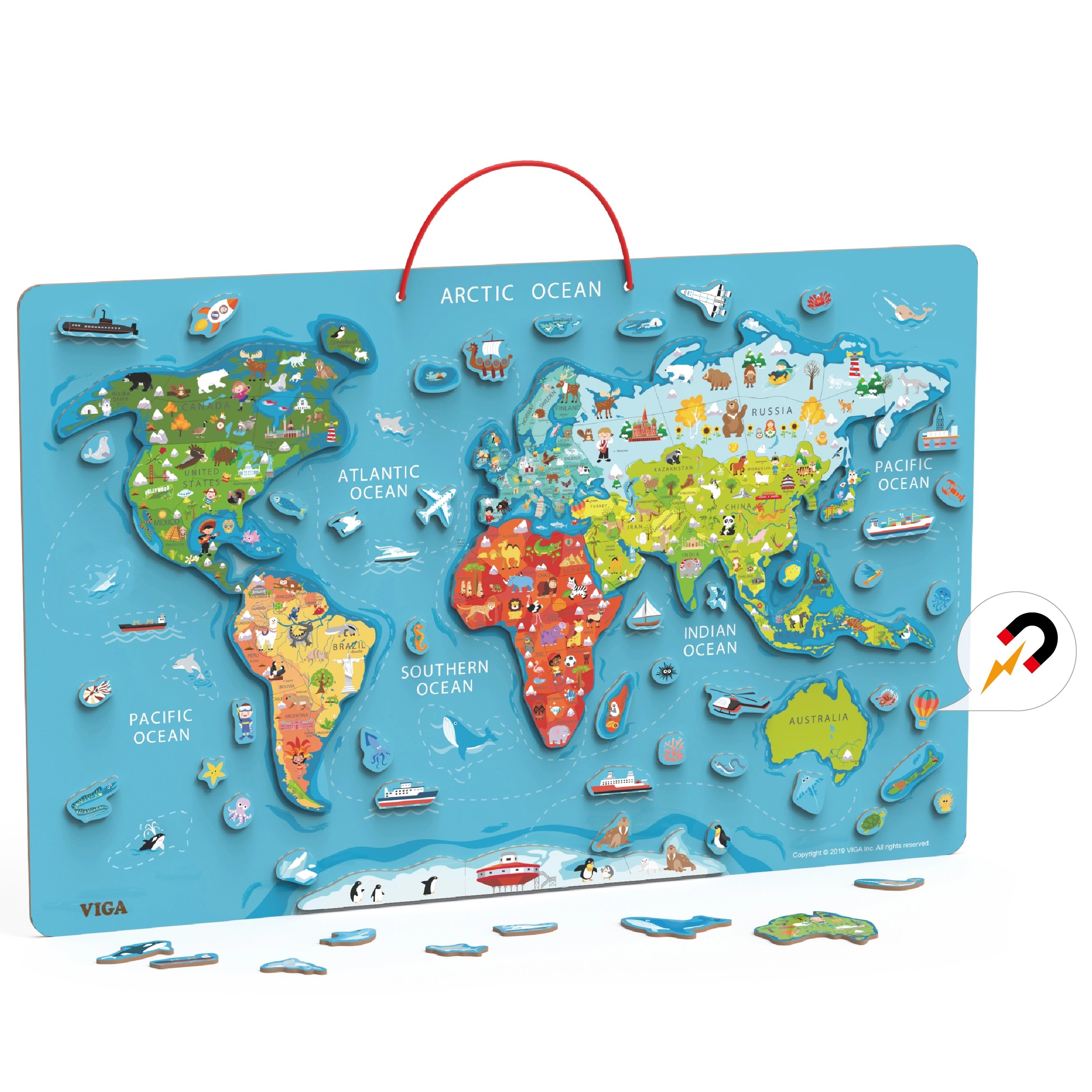 Картата се състои от 106 магнитни елемента, изобразяващи държави, превозни средства и животни, което улеснява изучаването на география.