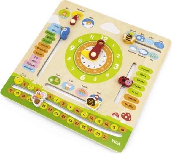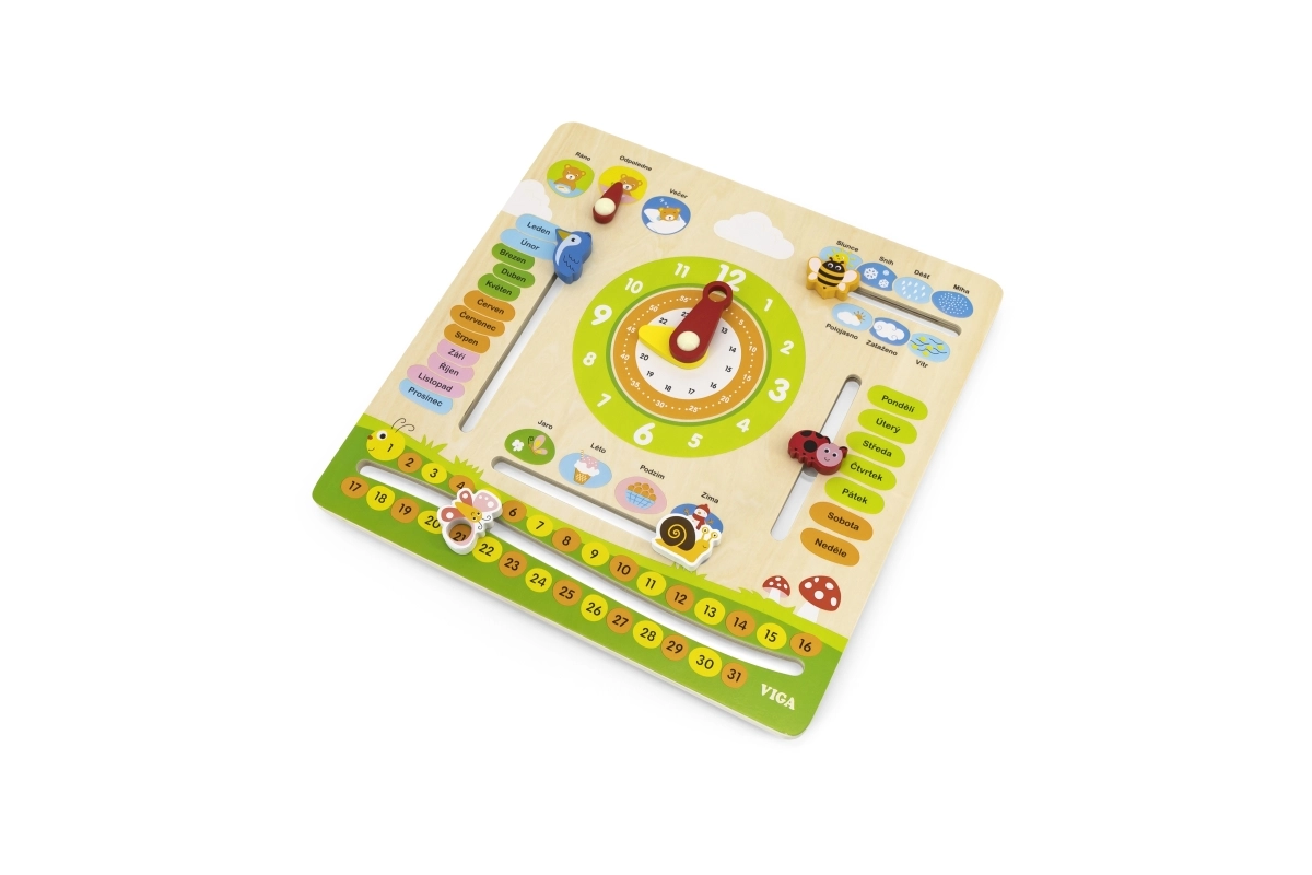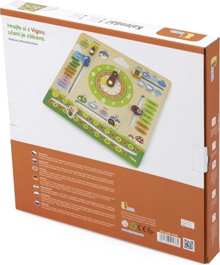 Дървеният календар VIGA е образователна помощ за предучилищна възраст, която съчетава учене и игра. Благодарение на ясното оформление и чешките надписи децата лесно усвояват основни понятия от ежедневието. Подвижните елементи – стрелки на часовник, показател за времето и сезоните – насърчават активното участие и развиват фината моторика.