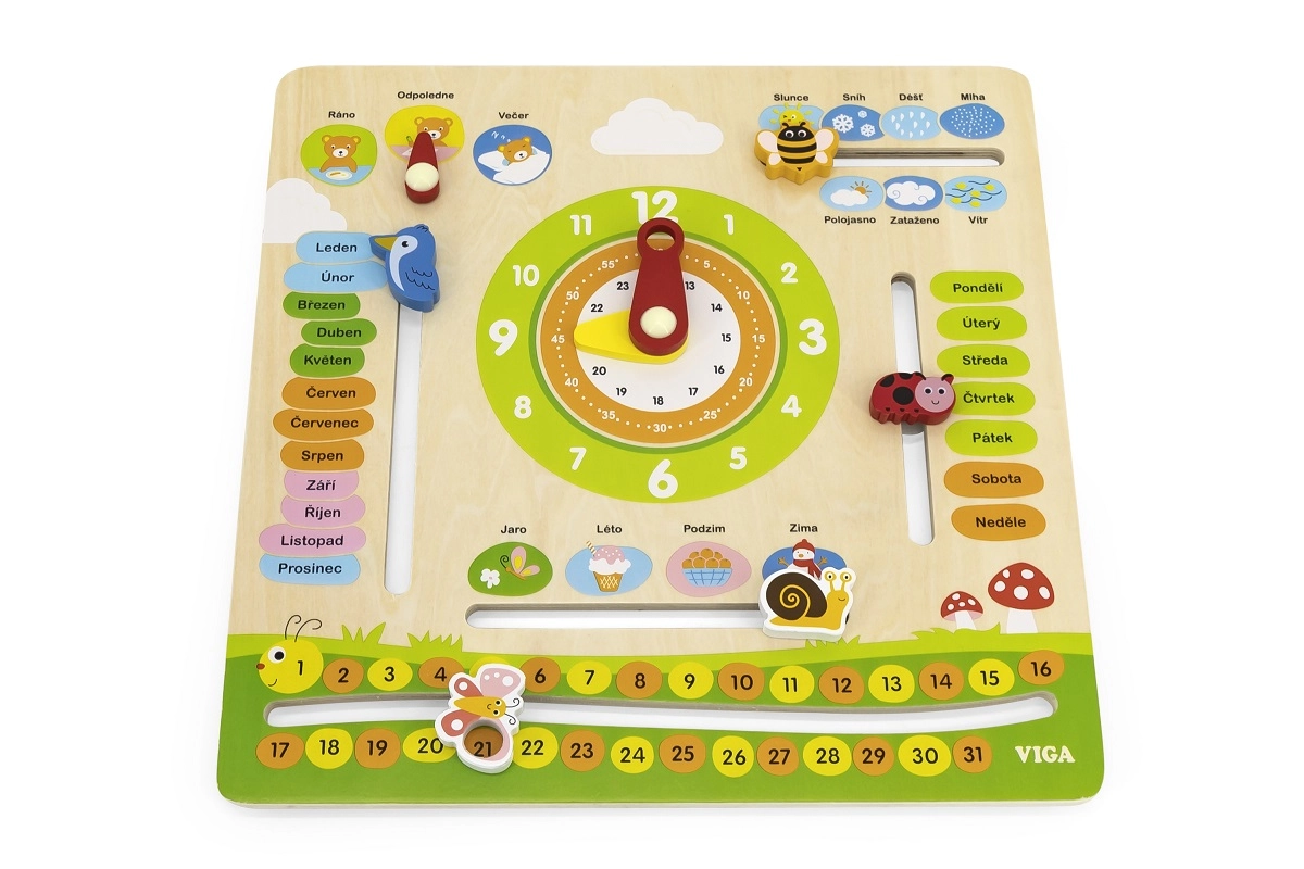 Умен и забавен дървен календар VIGA на чешки език помага на децата по игрив начин да учат месеци, дни от седмицата, часове, годишни сезони, време, числа и части от деня. Подвижните стрелки и показателите развиват фината моторика и насърчават самостоятелното откриване.