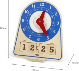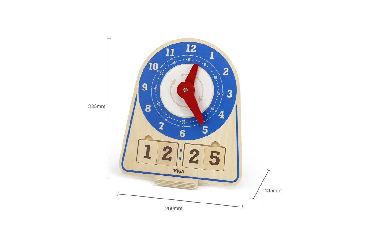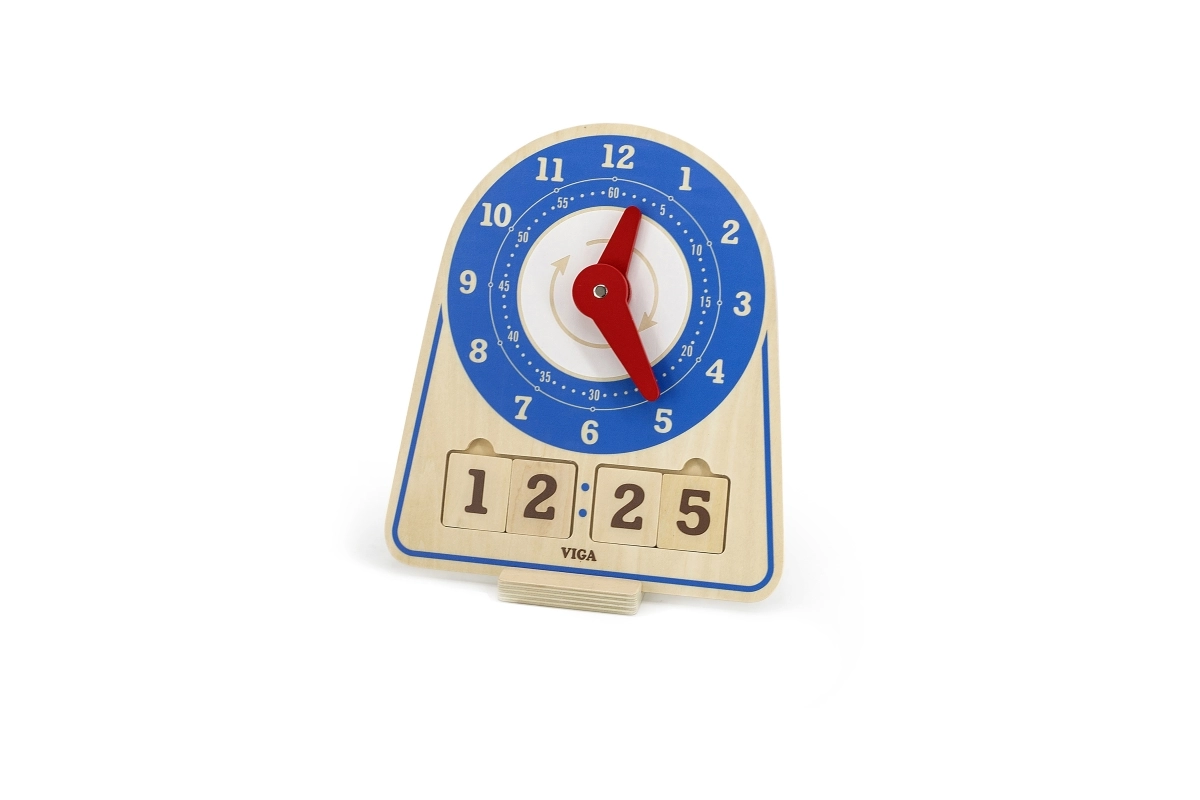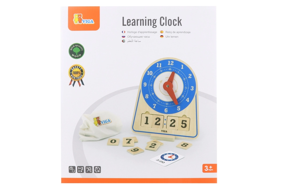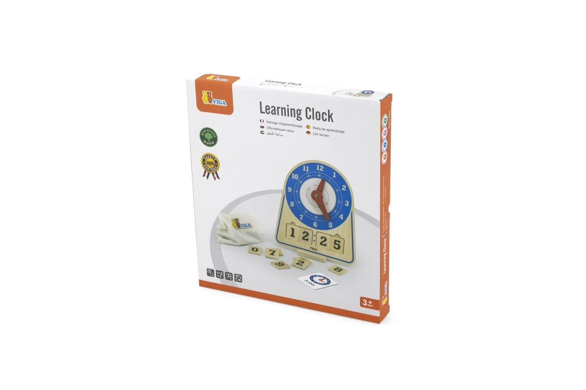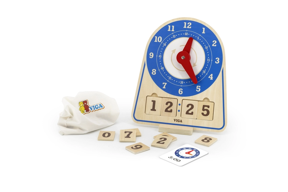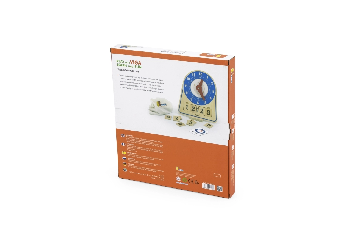 Дървените часовници за обучение на време от марката Viga са изключително учебно пособие, което комбинира забавление и учене. Тази самостоятелно стояща играчка включва 12 инструкционни карти, които помагат на децата да се научат да разчитат часовника. Детето може самостоятелно да настрои произволен час с помощта на картите или да се научи да следва часовете. Екологичната торбичка позволява лесно съхранение на аксесоарите.