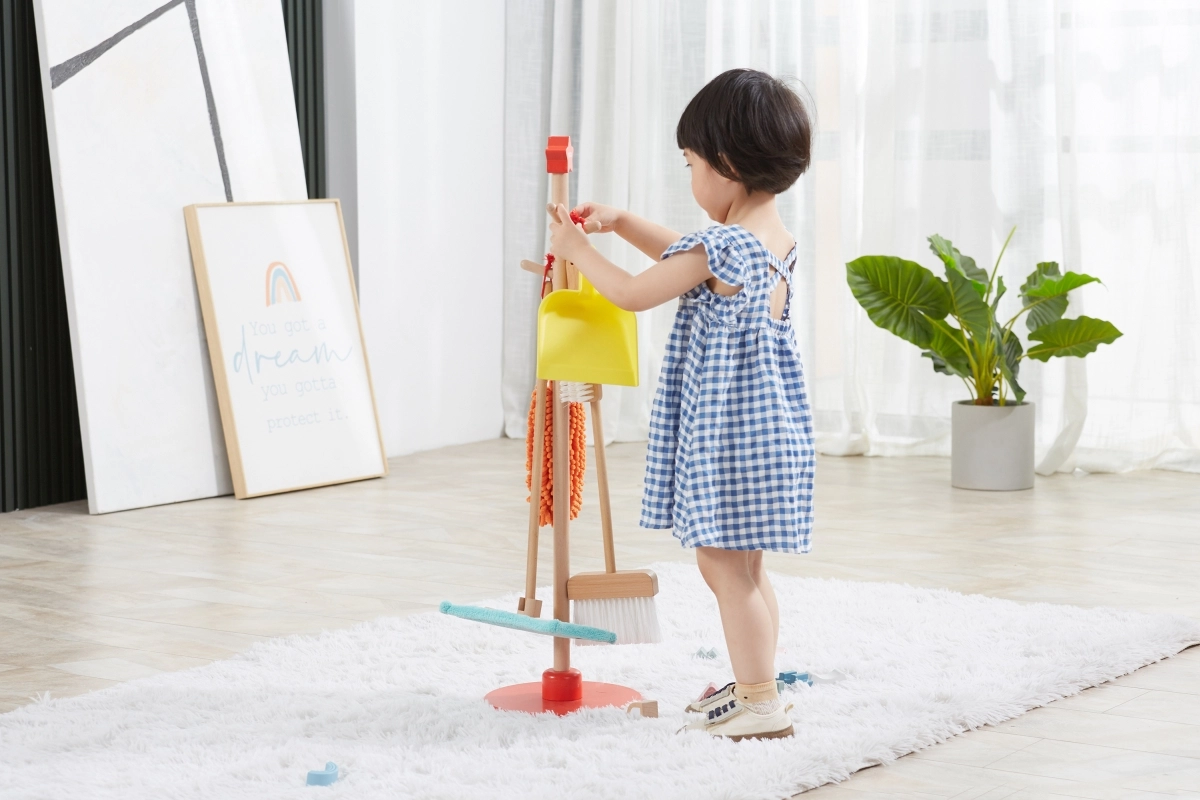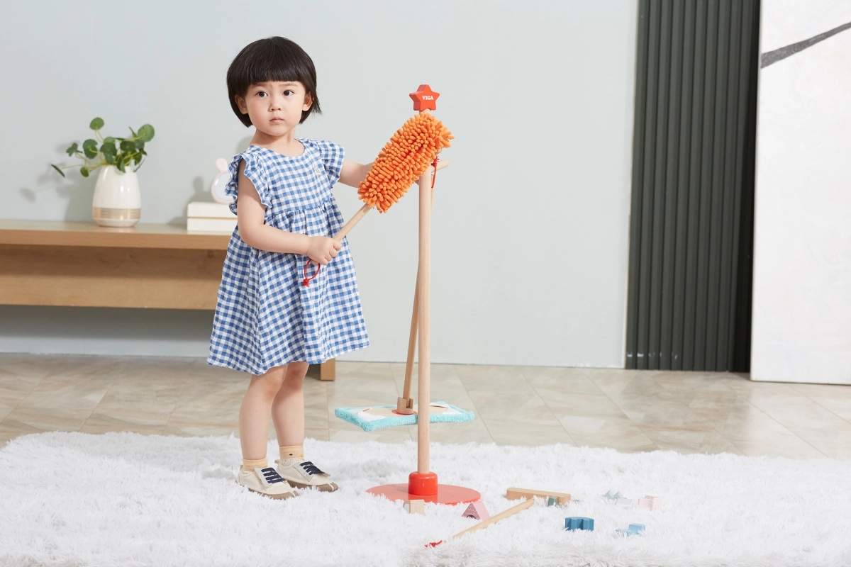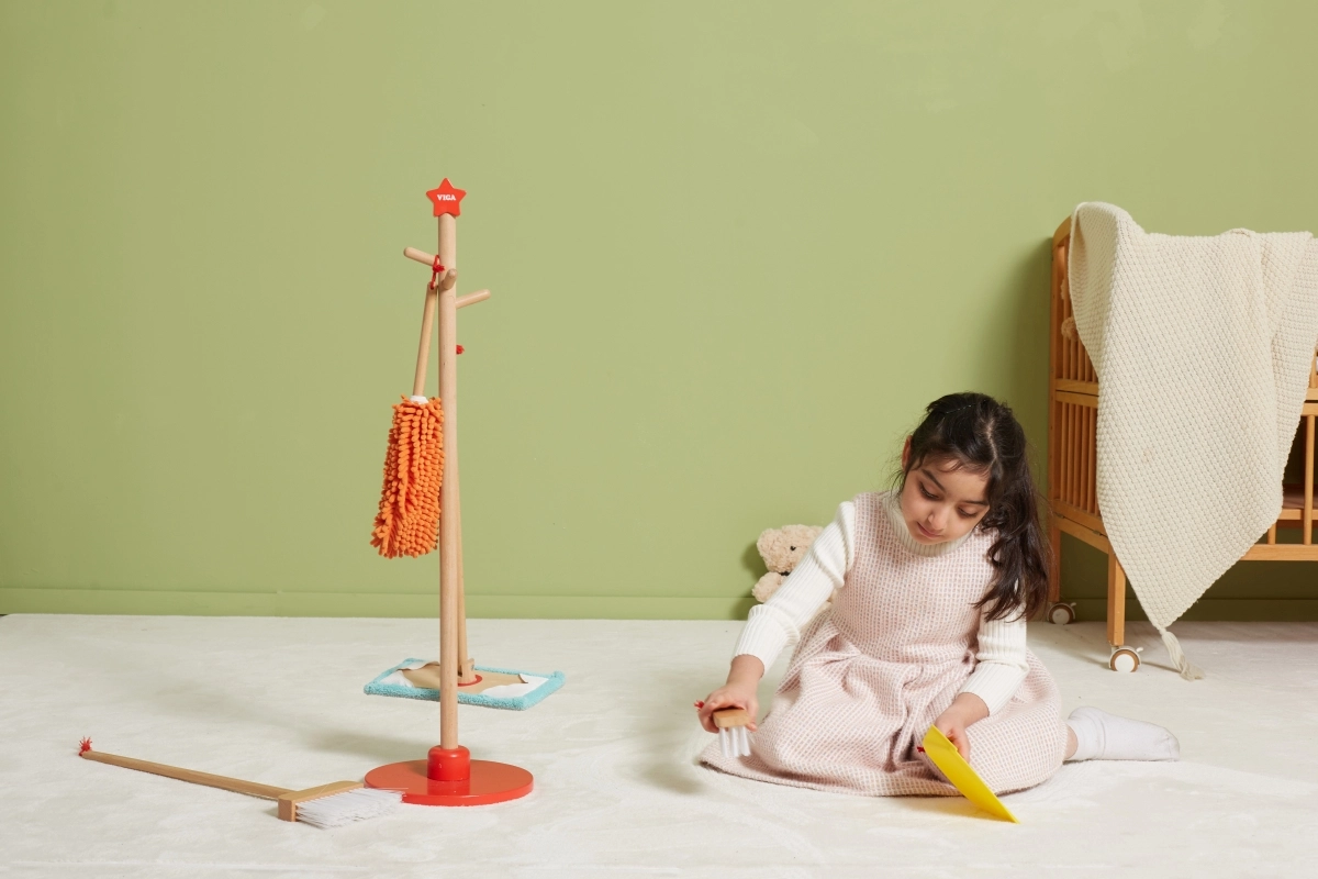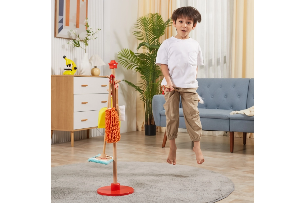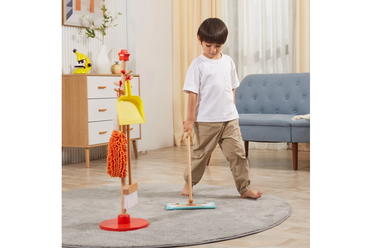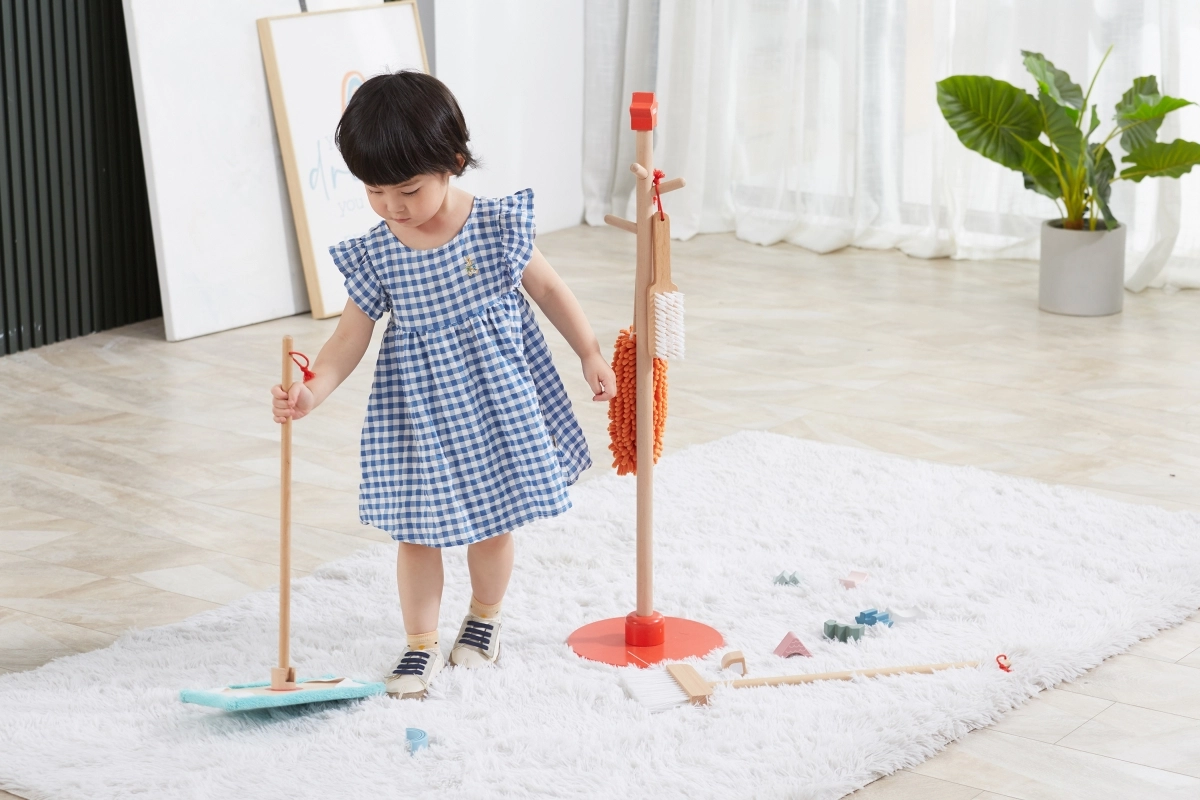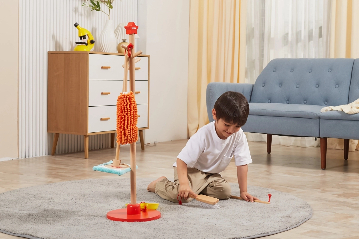 Благодарение на разнообразните инструменти за почистване децата усъвършенстват своята моторика и равновесие, докато играят.