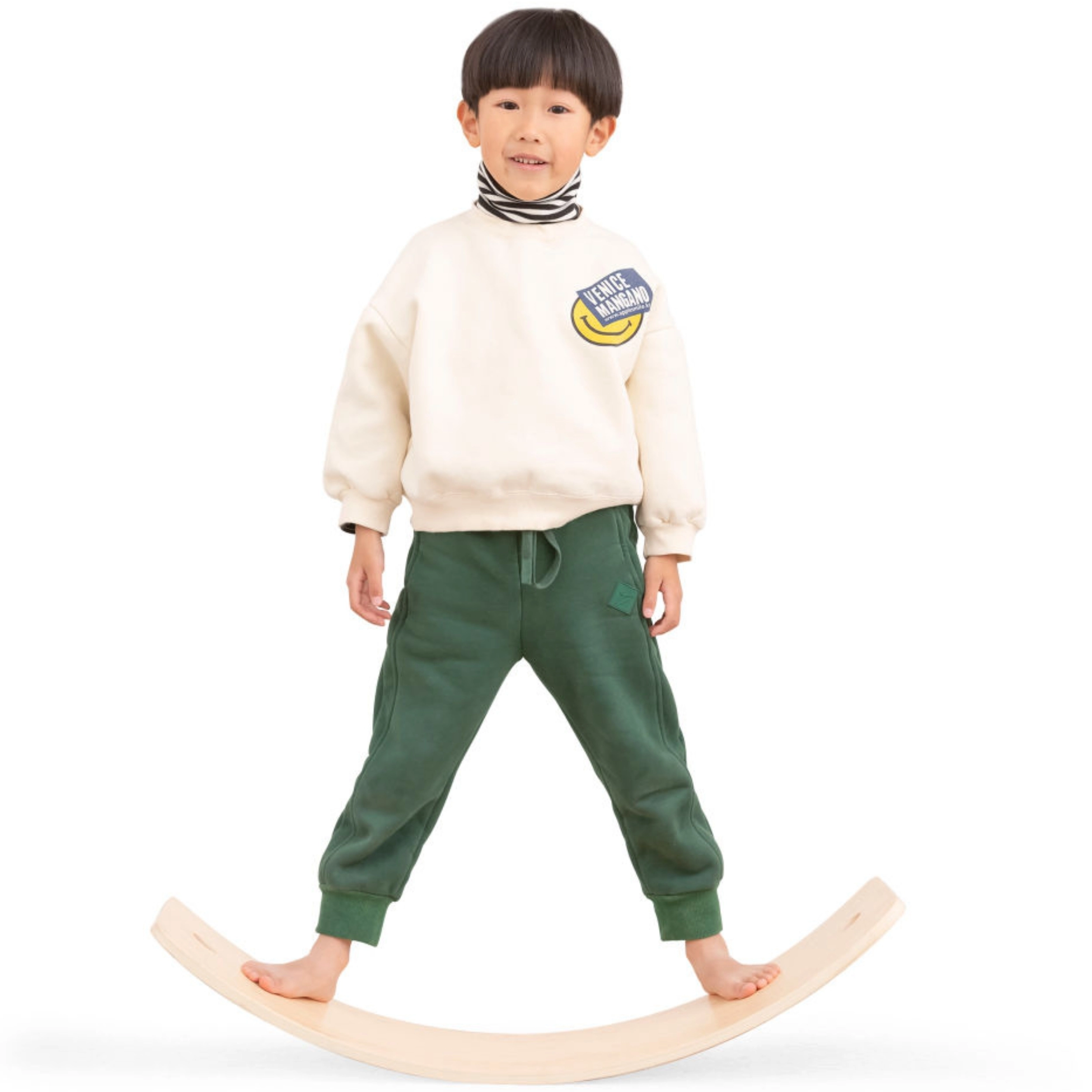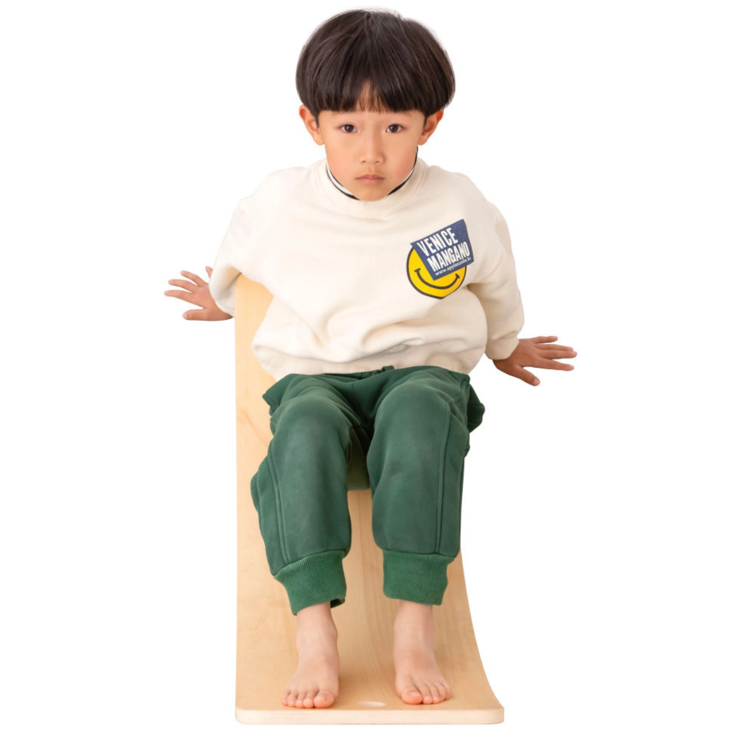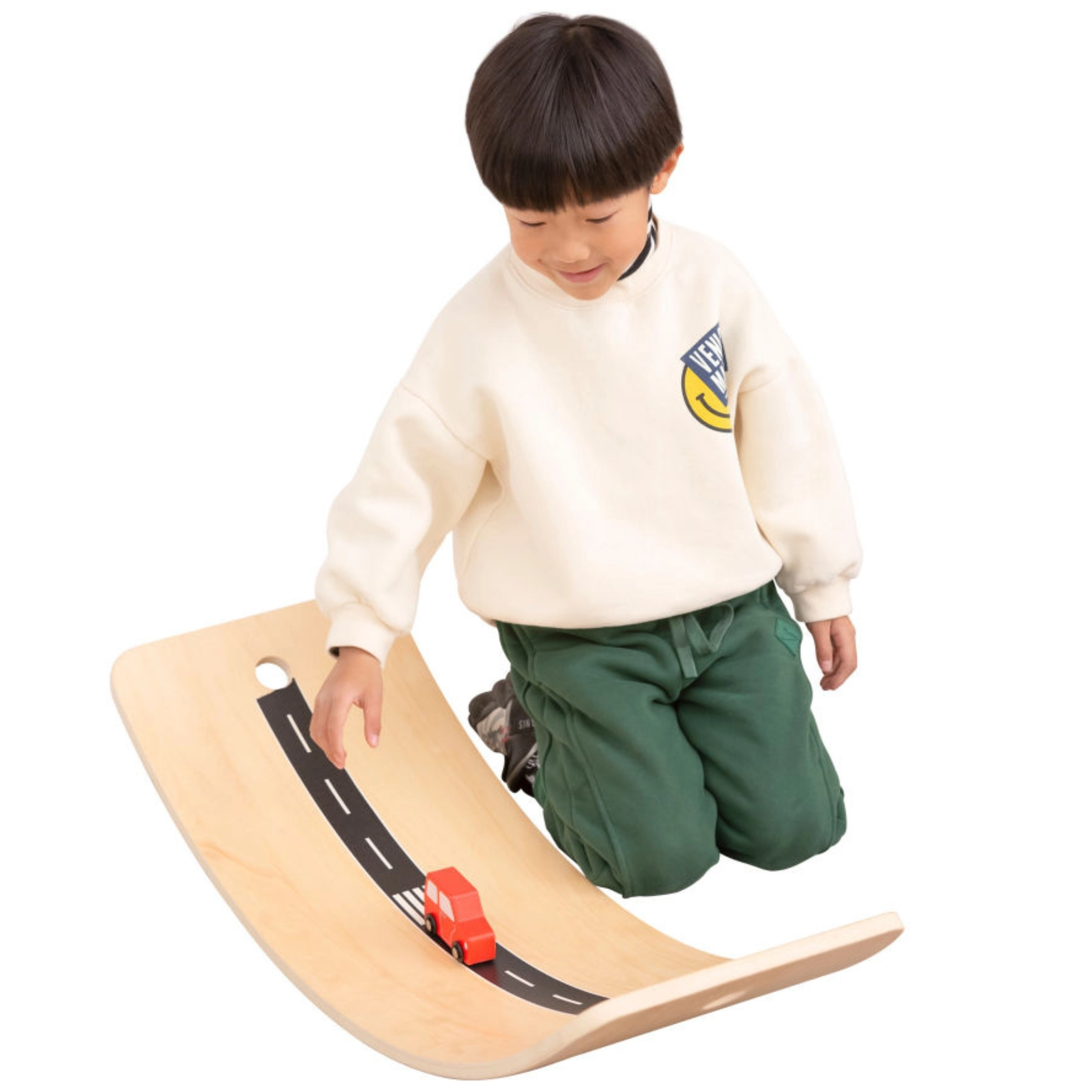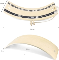 Извитата форма на дъската насърчава децата да се люлеят, да застават прави и да позират, като така развиват координацията, стабилността и центъра на тялото по безопасен и забавен начин.
