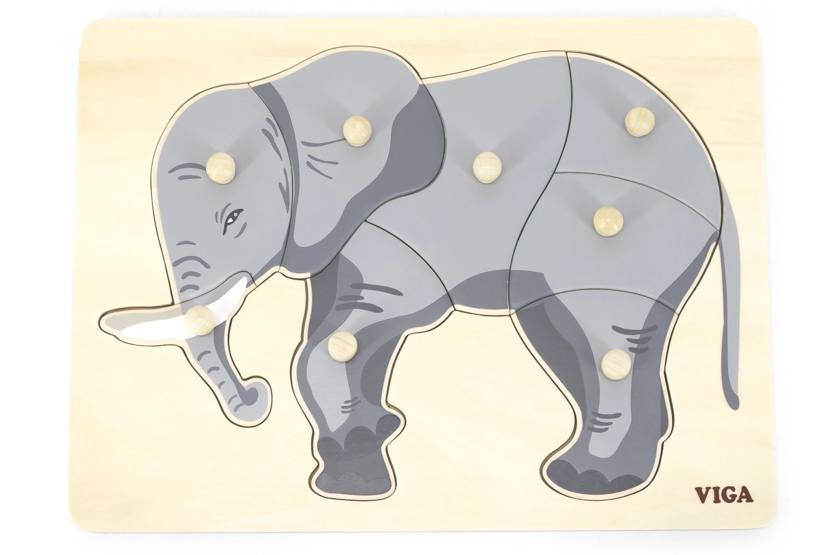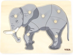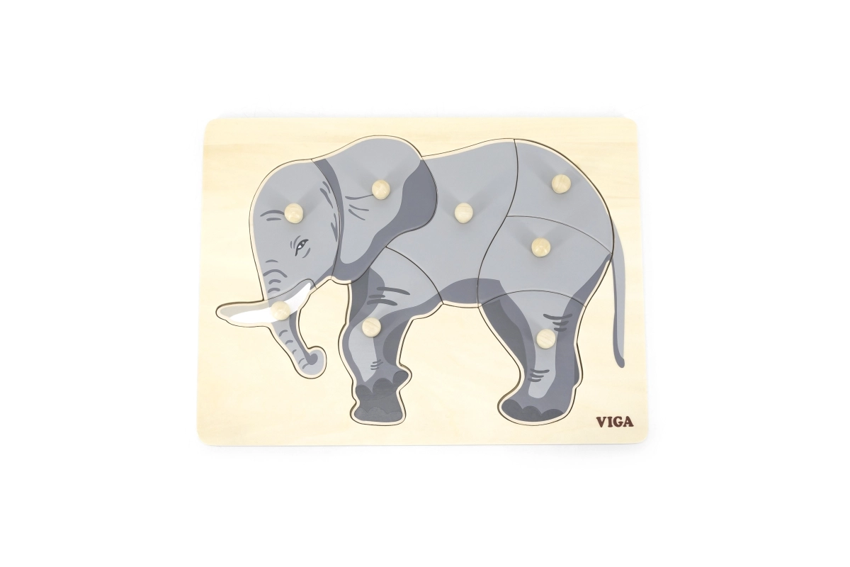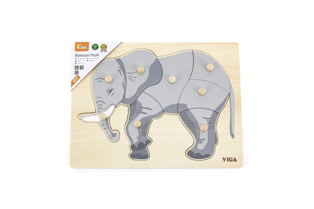 Дървен Монтесори пъзел с вложки Слон предлага забавление и едновременно развива фината моторика и логическото мислене при децата. Благодарение на дръжките на всяко парче манипулирането е лесно дори за най-малките. Идеален за деца от 18 месеца.