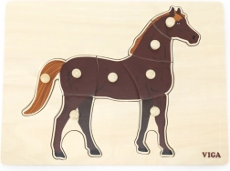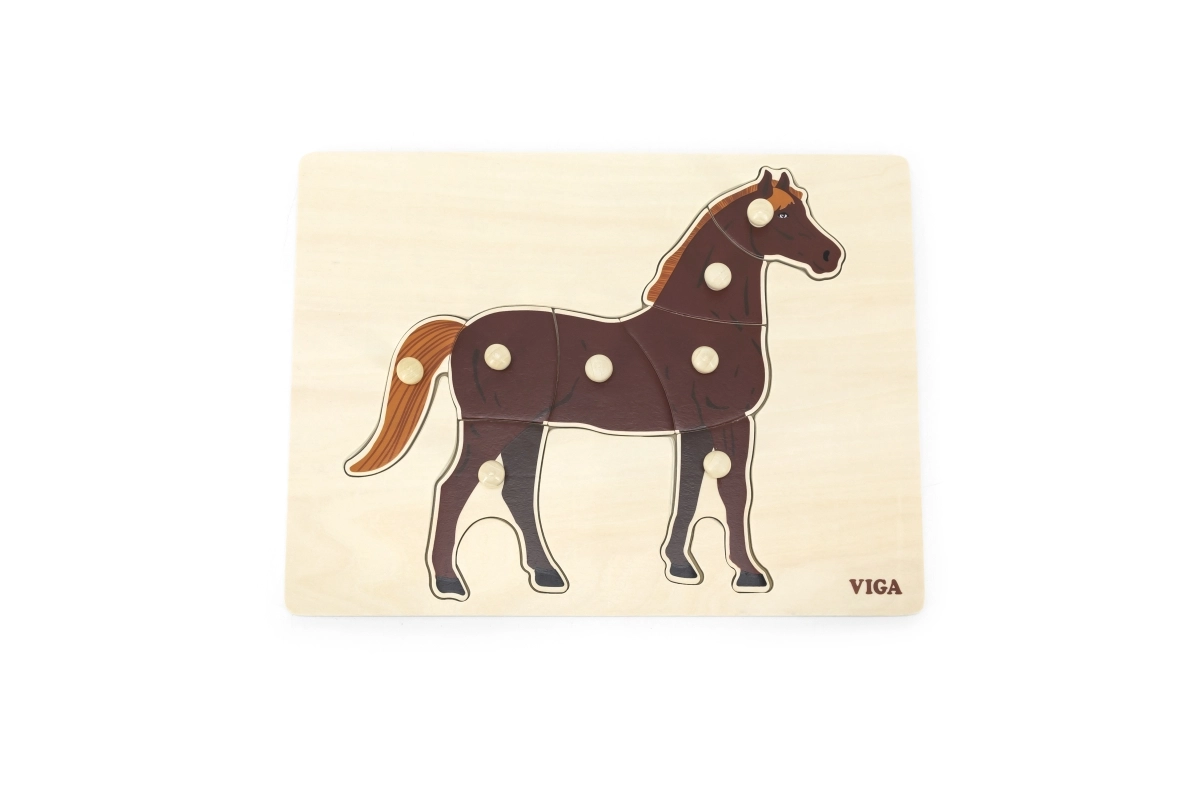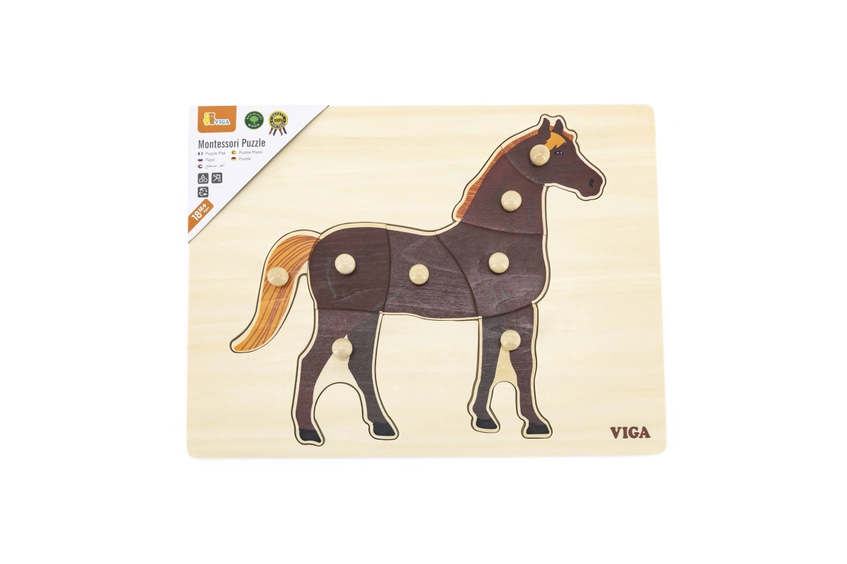 Монтесори пъзел-вкладачът с реалистичен мотив на кон насърчава децата към самостоятелно откриване и съсредоточаване. С практичните дръжки лесно хващат отделните елементи, учат се да разпознават форми и тренират прецизността на движенията. Благодарение на контраста между естественото дърво и кафявото конче контурите са ясно видими и примамват към игра.