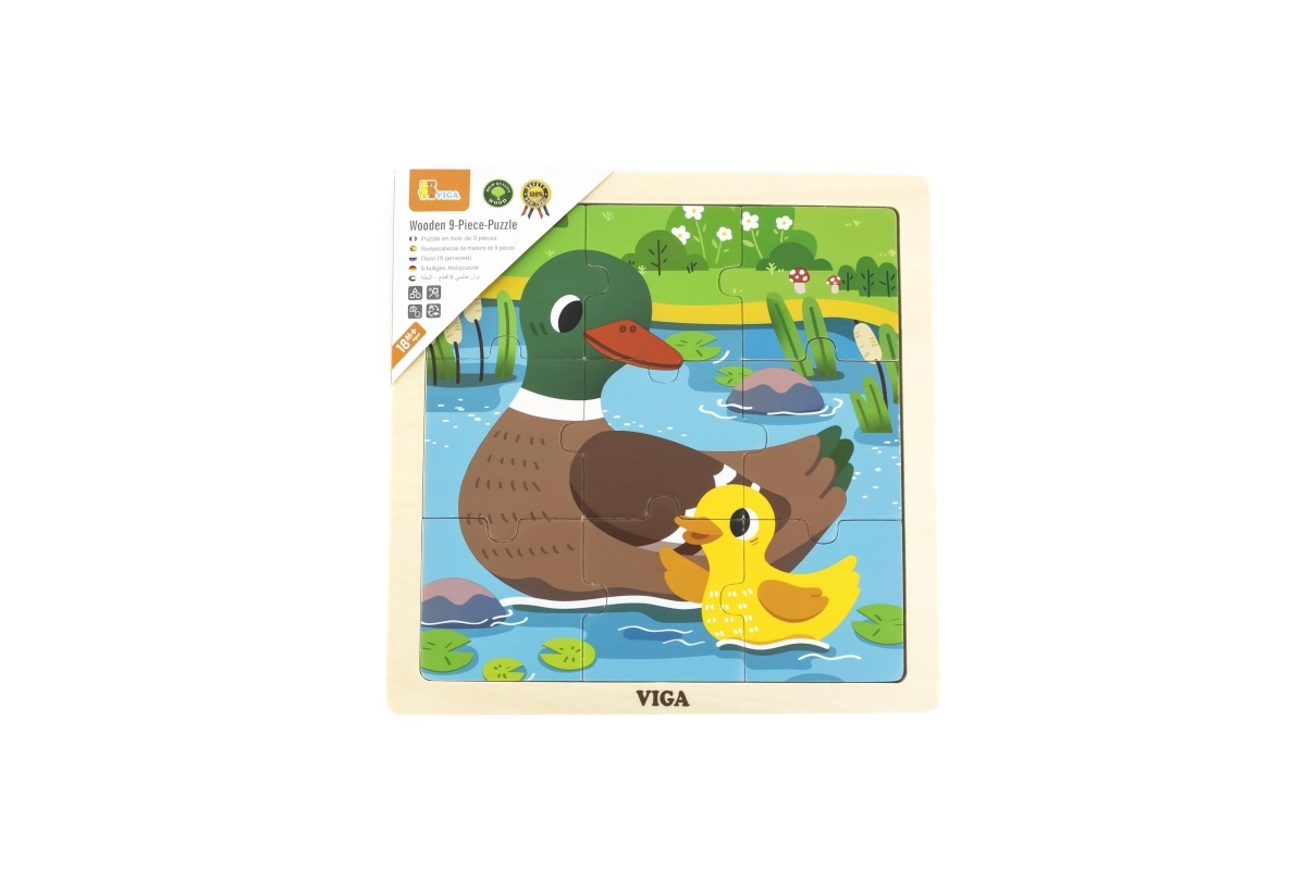 Детският дървен пъзел с мотив на патица и патенце носи забавно учене чрез игра. Девет здрави части се подреждат в дървена рамка и създават весел образ на езерце. Ярки цветове, издръжлив материал и добре обмислена форма на частите улесняват манипулацията и първите успехи при подреждане.