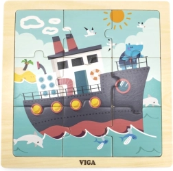 Тази дървена сглобка с мотив цветна лодка и морски животни съдържа 9 тематични части, които се поставят в фрезовани отвори в дъската. Ярките цветове и простите форми подпомагат концентрацията и мотивират децата да подреждат отново и отново.